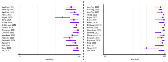 A total of 18 studies met the inclusion criteria and addressed the diagnostic accuracy of transvaginal ultrasound for detecting rectosigmoid deep infiltrating endometriosis prior to surgery. Of these, 44.44% (n = 8) focused exclusively on the digestive component of the posterior compartment. Regarding study design, seven papers employed a retrospective approach, ten were prospective, and one study combined both methodologies. Moreover, 61.11% (n = 11) recruited patients from a single diagnostic and treatment center. The average number of patients per study was 228, ranging from 42 to 878, and the mean age of the study population was 34.7 years. The average reported sensitivity and specificity were 83.05% (range 52.9–96.2%) and 90.53% (range 50–100%), respectively. A visual synthesis of these results is provided in the forest plots (Figure 4), which illustrate the variability in diagnostic performance across studies despite overall high values. Additional methodological details, including patient preparation, adjunctive techniques, and technical specifications of the ultrasound examinations, are summarized in Supplementary Table S3.
