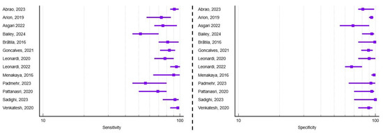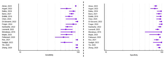 Out of the 30 studies included in this systematic review, 17 assessed the diagnostic accuracy of transvaginal ultrasound in detecting deep infiltrating endometriosis involving the uterosacral ligaments. Among these, 35.3% (n = 6) focused exclusively on this anatomical landmark. Regarding study design, eight were prospective, eight were retrospective, and one combined both methodologies. Most studies (76.47%) were conducted in single tertiary centers, ensuring consistent sonographic technique and standardized surgical correlation. The average number of patients per study was 387, ranging from 42 to 4983, with a mean age of 35.2 years across cohorts. Transvaginal probes between 5 and 12 MHz were predominantly used for high-resolution pelvic imaging. The average reported sensitivity and specificity were 78.07% (range 56–97%) and 90.49% (range 75.1–100%), respectively. A visual synthesis of these results is provided in the forest plots (Figure 5), which illustrate the variability in diagnostic performance across studies despite overall high values. Additional technical and methodological parameters related to ultrasound protocols, reporting systems, and diagnostic thresholds are detailed in Supplementary Table S3.