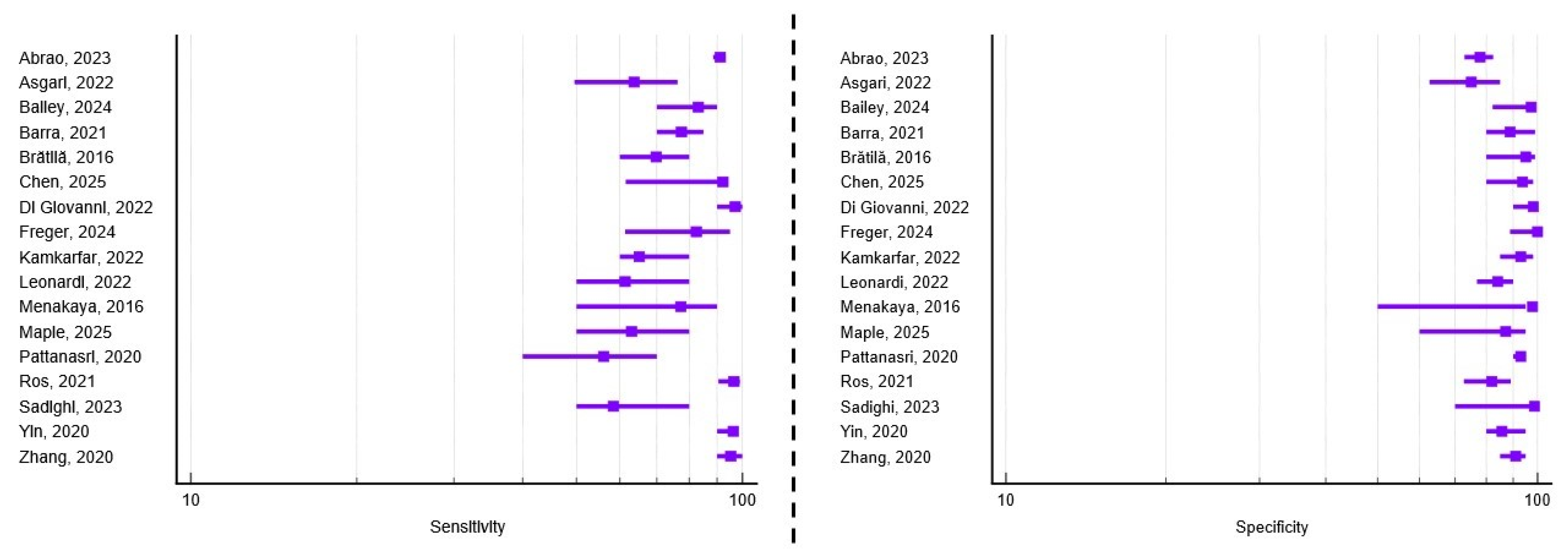 14. | Freger, 2024 [26] | Canada | Prospective Single-center | 54 | 35.2 | 4–9 | Laparoscopy Biopsy | N/A | Se = 82.6 Sp = 100 Acc = 92.6 | N/A |