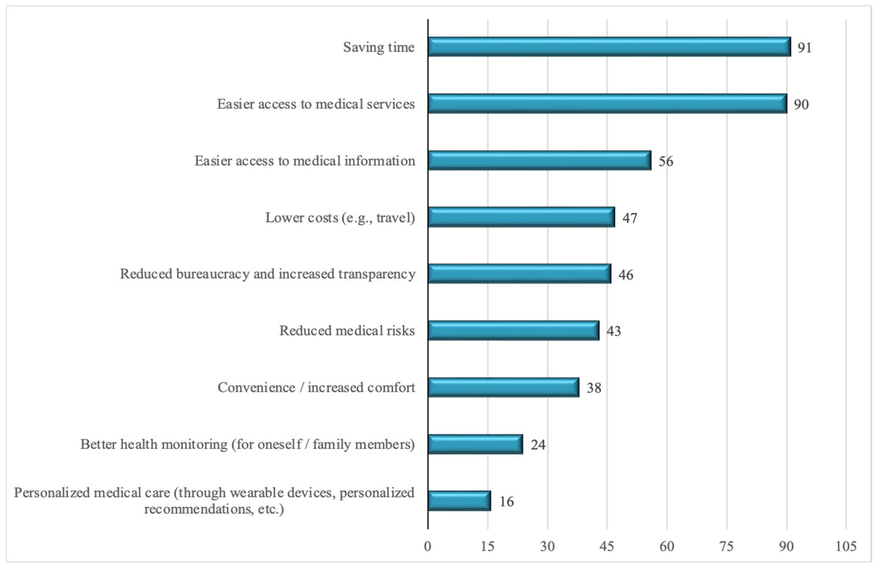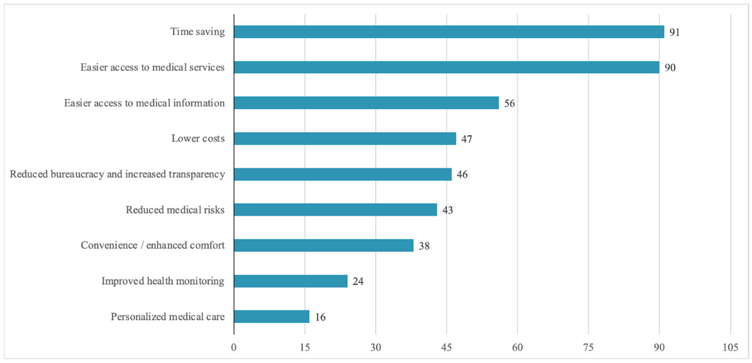 p < 0.001). None of the other benefits showed a statistically significant effect at the conventional threshold. In contrast, even after applying a Bonferroni correction for multiple testing, “easier access to medical services” retained statistical significance. This highlights that, while patients mention several potential advantages of digitalization, satisfaction is most strongly and consistently tied to improved access to care.
