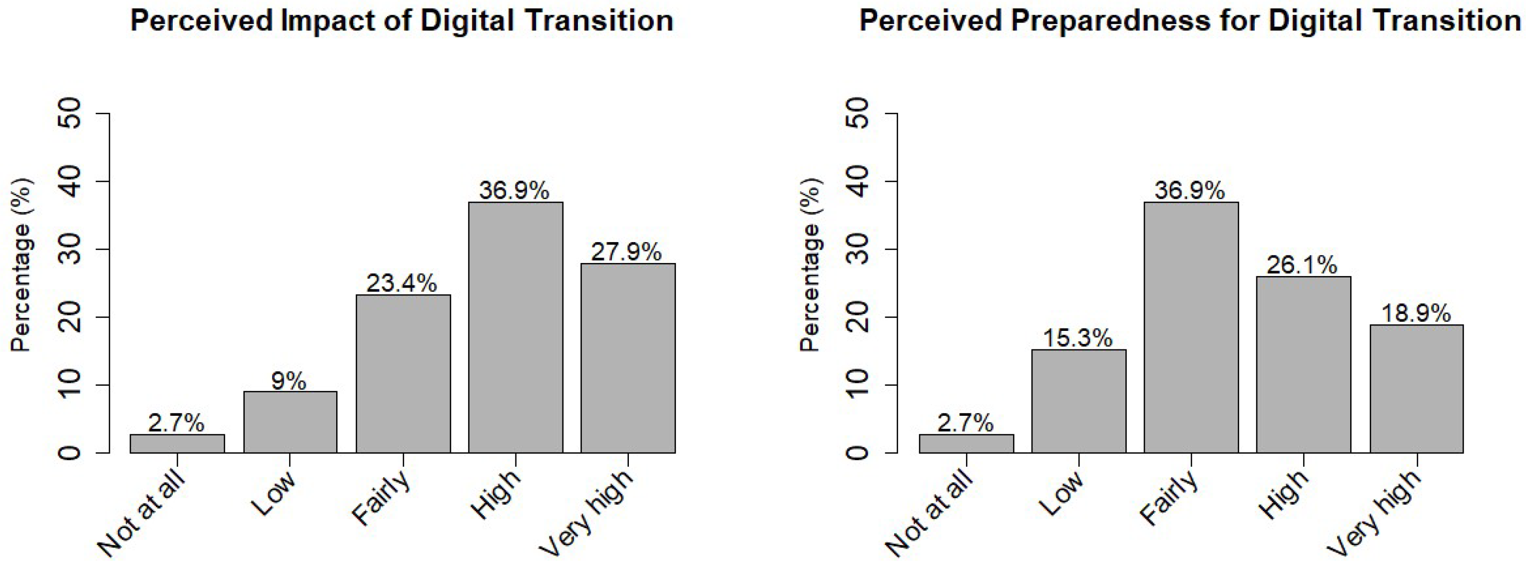 In line with the centrality of digital preparedness highlighted in the introduction, the majority of participants (88%) reported that digital transition already has a tangible impact on their professional activities. This perception was consistent across roles, with particularly high recognition among administrative staff (91%) and nurses (90%). These findings suggest that healthcare professionals are acutely aware of the transformative effect of digital technologies on their daily practice, confirming the relevance of situating digital preparedness as a key dimension of professional well-being.
