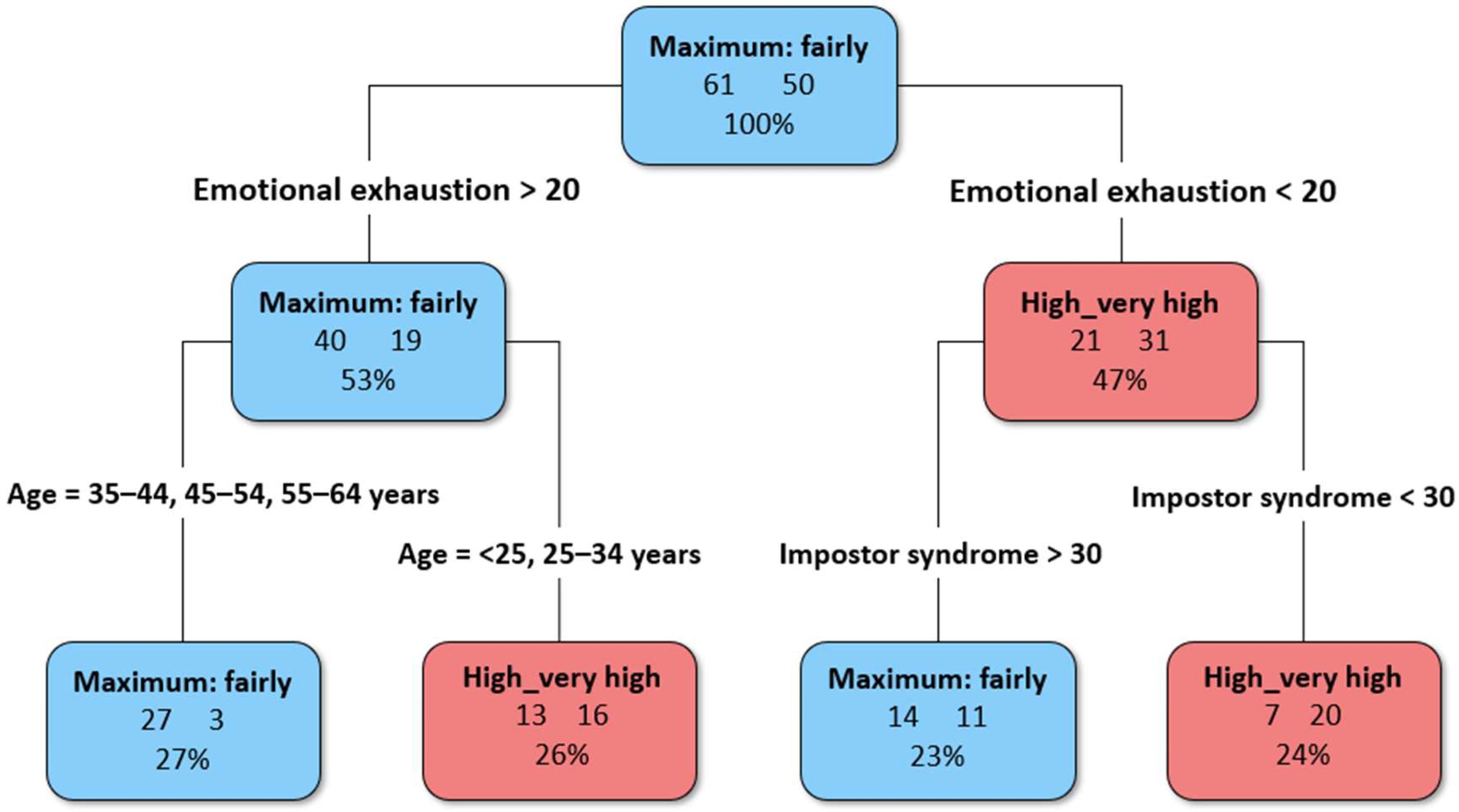 Figure 2), thus representing the first psychological construct to evaluate in the classification process. Individuals reporting levels of emotional exhaustion lower than 20 and levels of Impostor Syndrome below 30 were more likely to feel prepared to face the digital transition. Conversely, individuals reporting higher levels of emotional exhaustion (>20) and older than 35 years feeling were the least prepared. Although all the three burnout components, the overall organizational quality of work were included in the model, along with gender and professional information, these variables were not chosen by the procedure, indicating lower discriminative power in this classification.