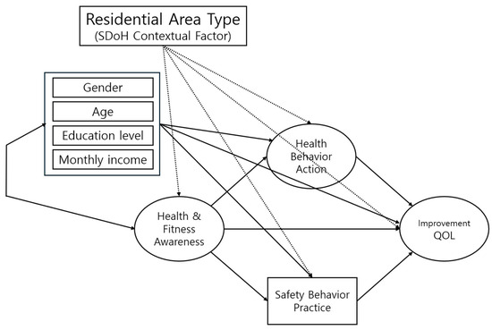 This study’s purpose was to empirically examine the structural relationships among factors influencing individual Health Behavior Action based on the theoretical SDH framework. Specifically, this study analyzes how social and perceptual factors affect health behaviors and examines whether these structural pathways differ across regions. To this end, SEM was conducted to investigate the relationships among Health & Fitness Awareness, Health Behavior Action, and Safety Behavior Practice. In alignment with the Social Determinants of Health (SDoH) framework, this study hypothesizes that Residential Area Type (large cities, mid-sized cities, and rural areas) acts as a structural moderator that shapes the hypothesized relationships between constructs. Specifically, Multigroup Structural Equation Modeling (SEM) was employed to test how the regional macro-context differentially impacts the strength and significance of the pathways connecting awareness, behaviors, and QOL improvement. This approach allows us to identify the structural basis of health inequality and propose regionally tailored policy responses. Figure 1 depicts the conceptual model used in this study.
