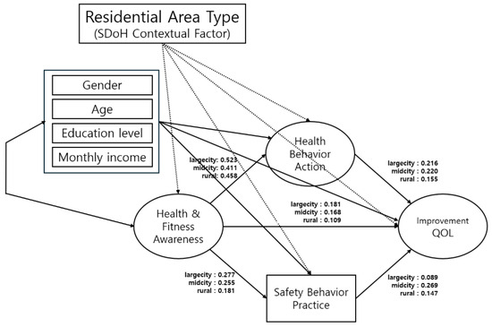 Second, this study provides empirical evidence for regional health inequality, a key concept in the SDH framework. Multigroup SEM results revealed significant differences across residential area types (large cities, mid-sized cities, and rural areas) in two structural paths: from Health and Fitness Awareness to Safety Behavior Practice and from Safety Behavior Practice to Improvement in QOL. This suggests that even with similar levels of health awareness, the translation of awareness into practice and improvements in QOL depends on the region’s social and environmental contexts.