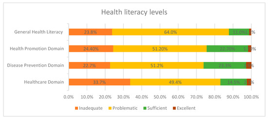 Figure 1 shows the distribution of participants across the different health literacy levels. Across all domains, most older adults fall into the problematic category, especially in General Health Literacy level.