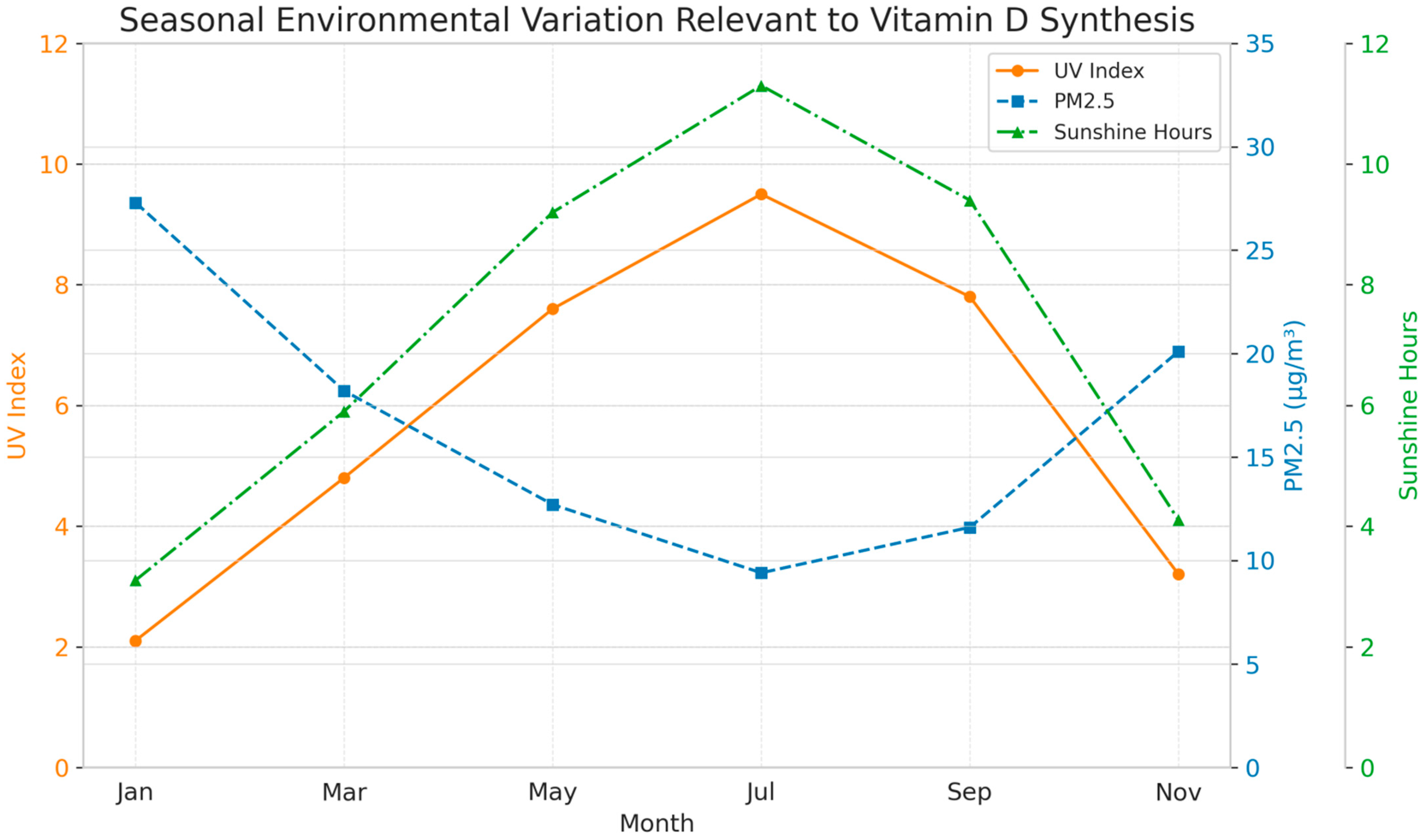 These findings suggest that environmentally sensitive supplementation policies may be required, integrating climatic variables (season, UV index) and atmospheric pollutants (e.g., PM2.5) into public health recommendations. A fixed-dose supplementation model may be insufficient in the face of dynamic environmental stressors that alter dermal synthesis efficacy throughout the year.