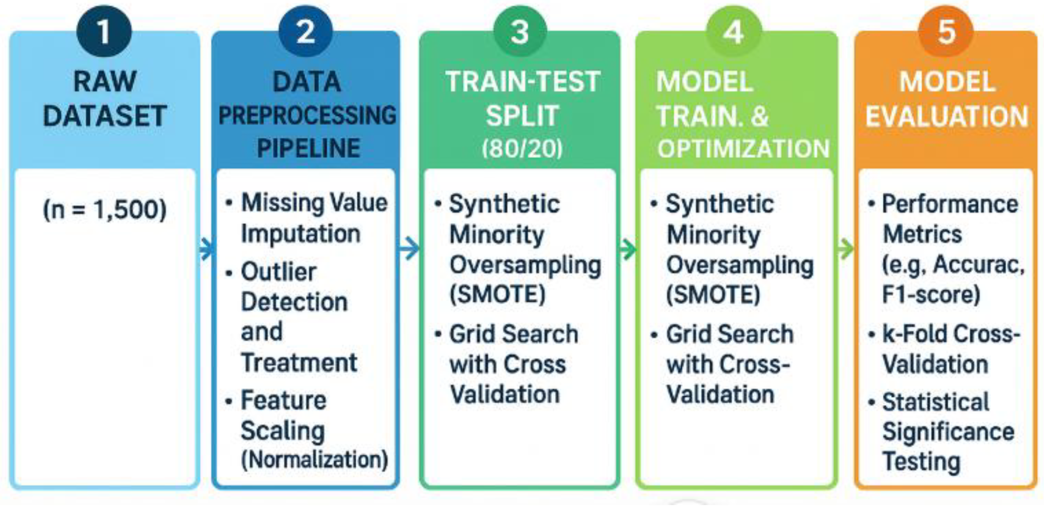 26] developed frameworks using ML with Explainable AI (XAI) tools achieving transparent predictions but reported moderate AUC values (approximately 0.85–0.90) on smaller datasets, highlighting the persistent need to better balance techniques such as SMOTE integration.