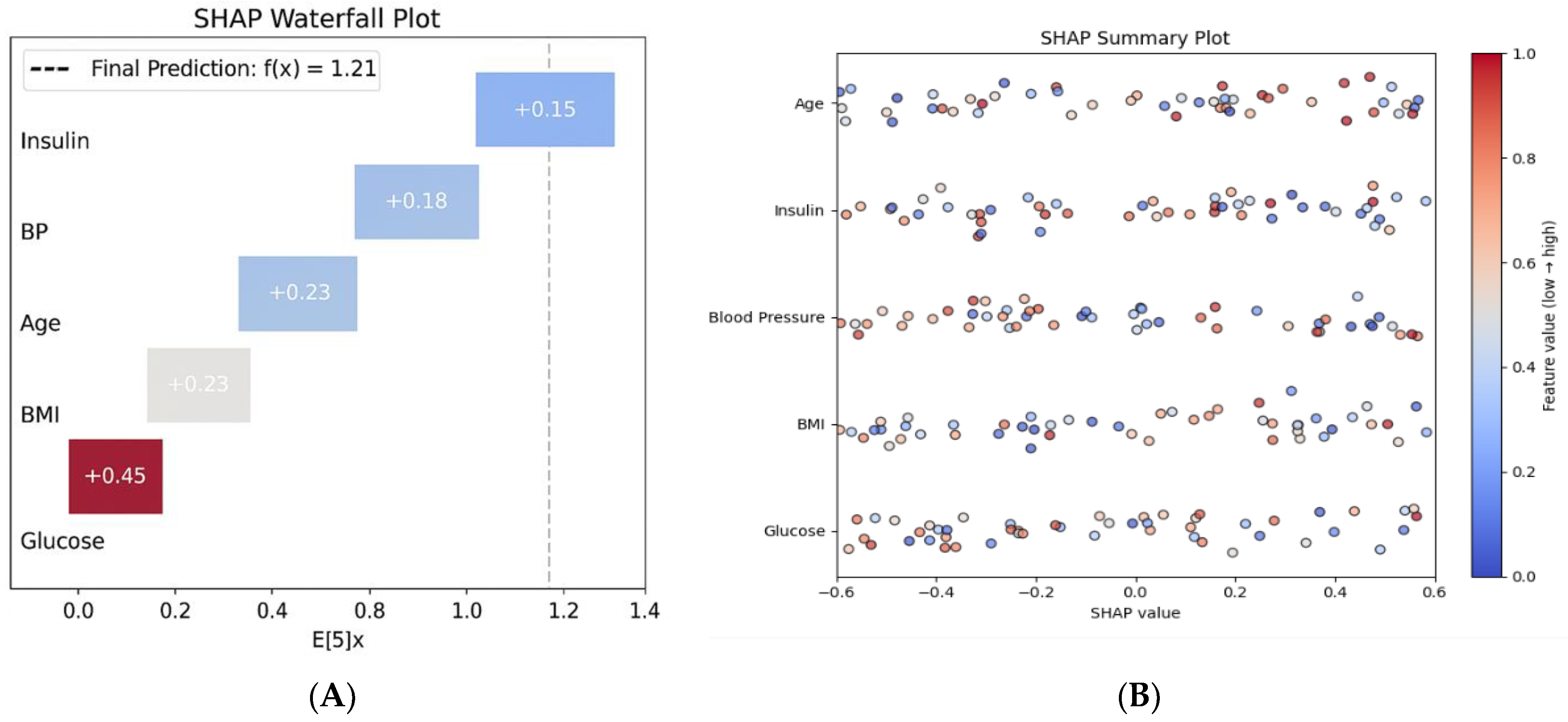 Figure 2A presents a SHAP waterfall plot that demonstrates how individual clinical features contribute to the prediction of high-risk diabetes for a representative patient. The model output, represented as f(x) = 1.21, is compared to the baseline expected value E[f(x)] = 0. Among the features, glucose has the strongest positive contribution (+0.45), followed by BMI (+0.23), blood pressure (+0.20), age (+0.18), and insulin (+0.15). All features contribute positively to the predicted risk, creating a cumulative effect toward diabetes classification. This local explanation allows clinicians to understand the reasoning behind individual predictions, facilitating personalized risk communication and shared decision-making.