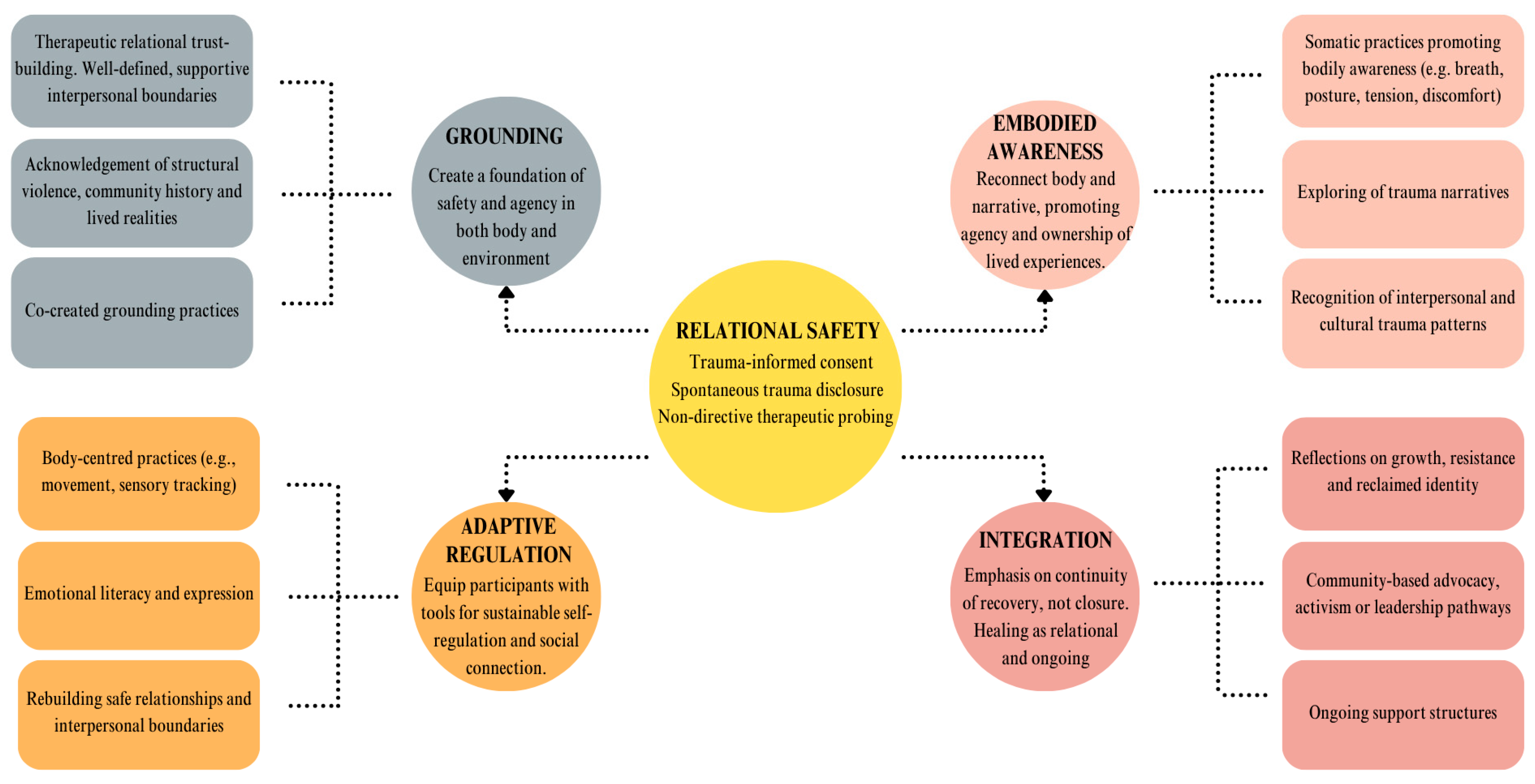 Table S1 include “Hold space—Emotion”, “Embodied awareness”, “Acknowledge”, “Reframe” and “Allow emotion”, reflecting a non-directive trauma-informed approach that prioritizes emotional safety and ample space and time for trauma awareness and processing. Rather than guiding the process through prescriptive techniques, these responses created open-ended opportunities for participants to gradually become aware of, express and integrate trauma at their own pace in a manner grounded in relational presence and embodied responsiveness. The setting of clear, consistent and supportive interpersonal boundaries that involved collaboratively defining the structure, pace and expectations of each session helped participants to develop a sense of predictability and control. The role of integrative silence in this process was paramount [
