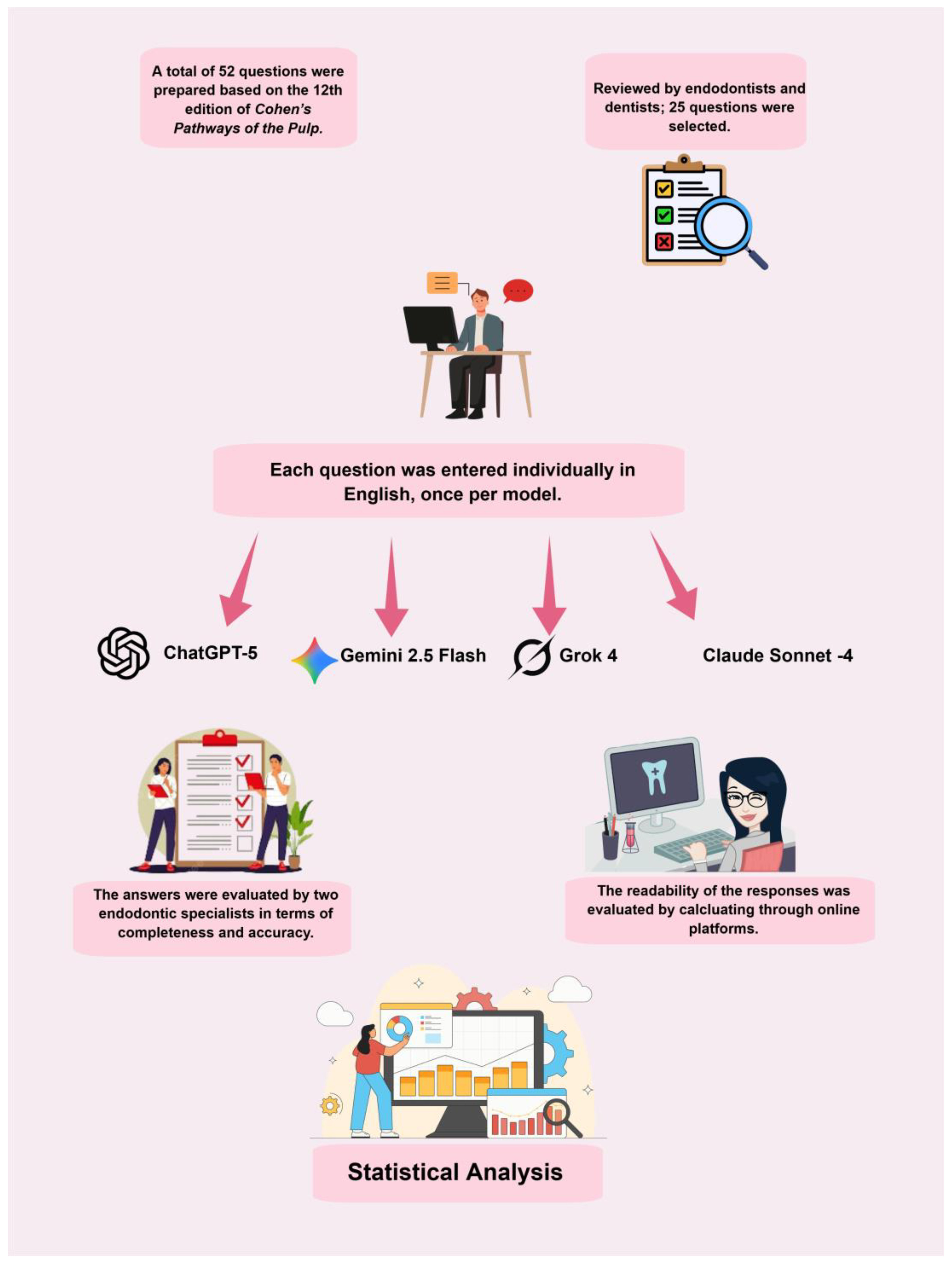 Patways of the Pulp (12th edition) book, which was used to prepare the questions. No pre-tests, prompt optimizations, or additional interventions were applied. Interactions with the models were limited exclusively to predetermined English questions prepared for research purposes. The English language was used for both the input and the output. Apart from this, no further instructions, interventions, or alternative forms of use were involved. No generation parameters (including temperature or sampling settings) were modified by the investigators. Accordingly, all responses were produced under the default system configurations, reflecting typical real-world usage conditions.