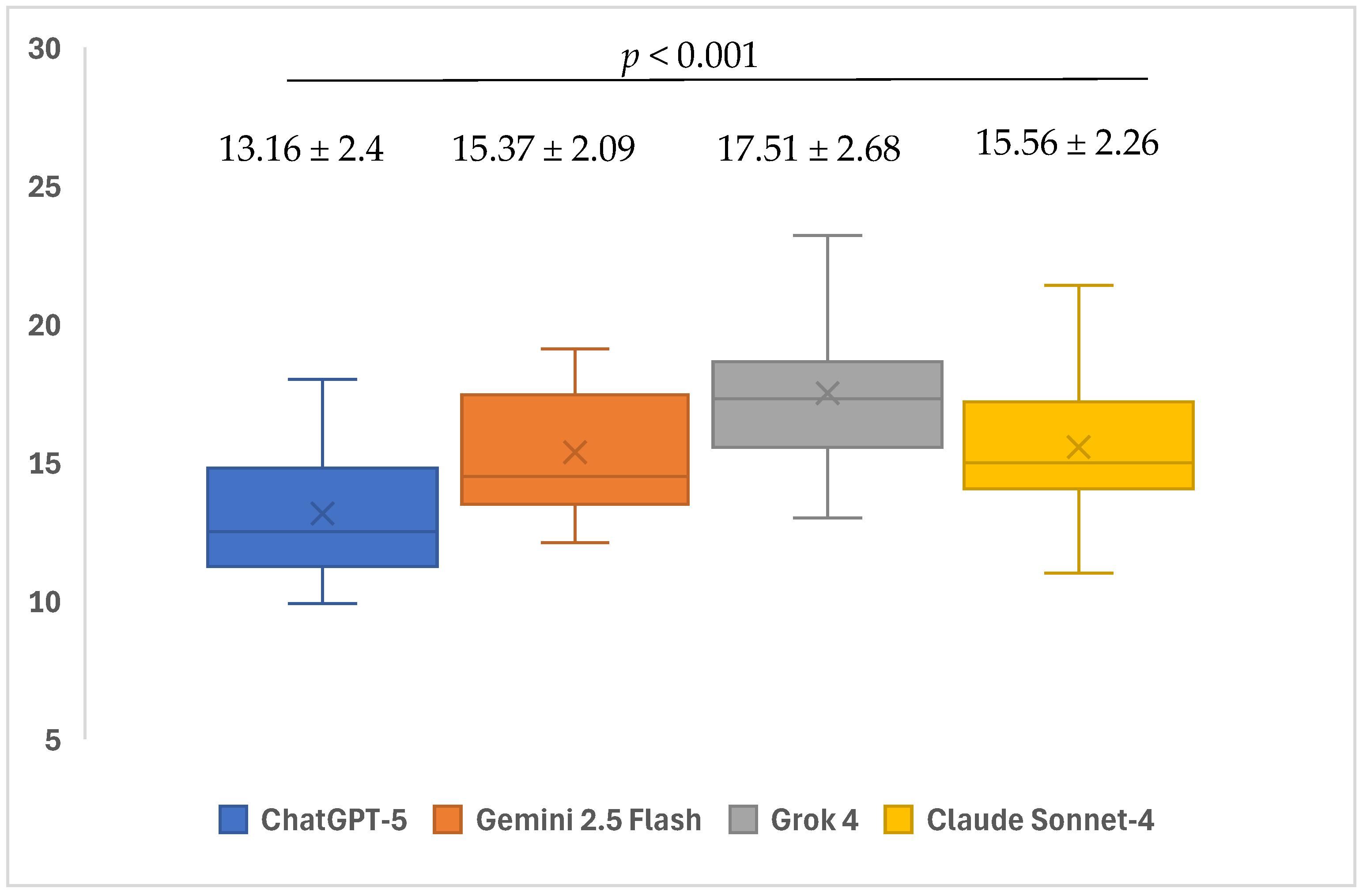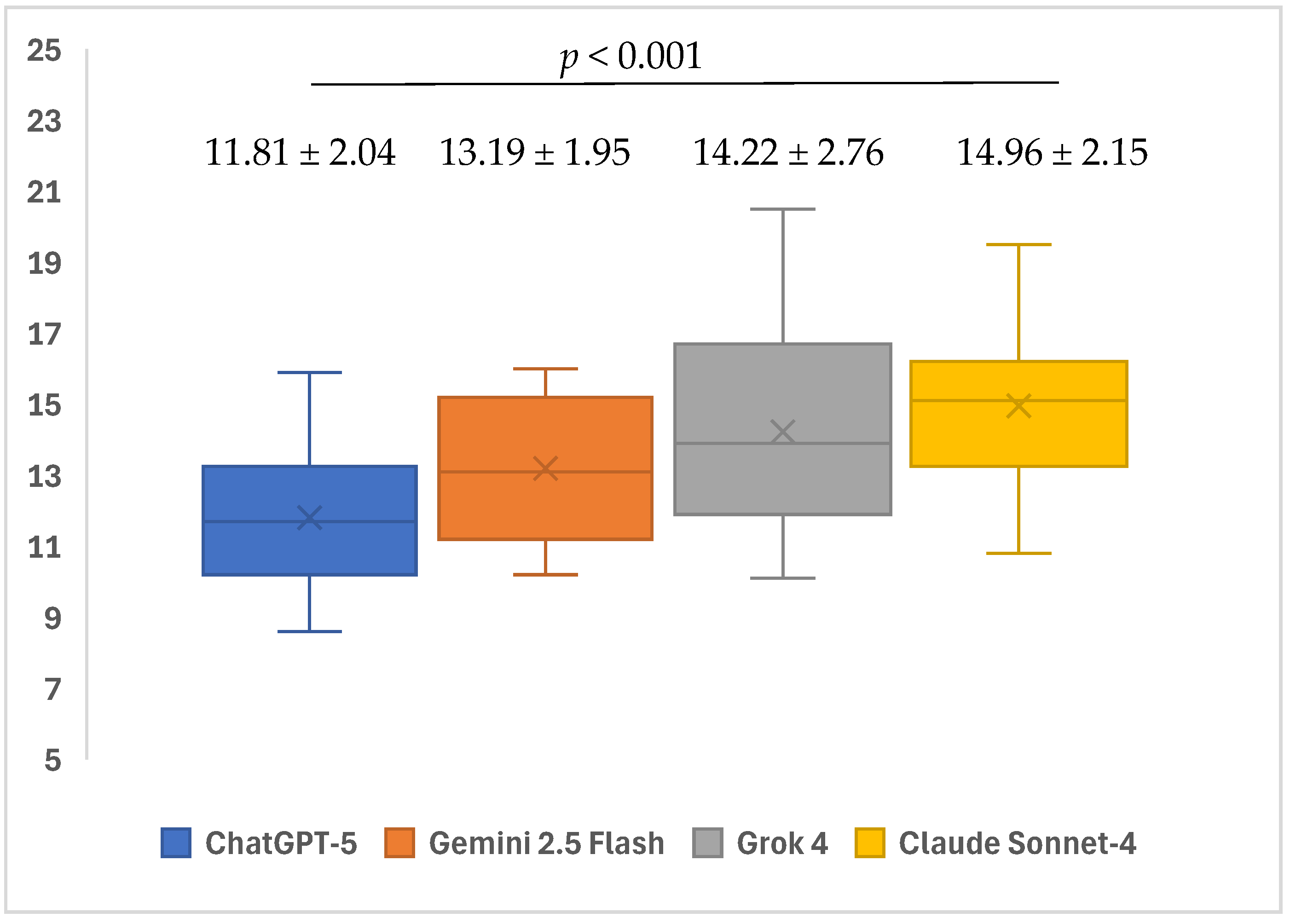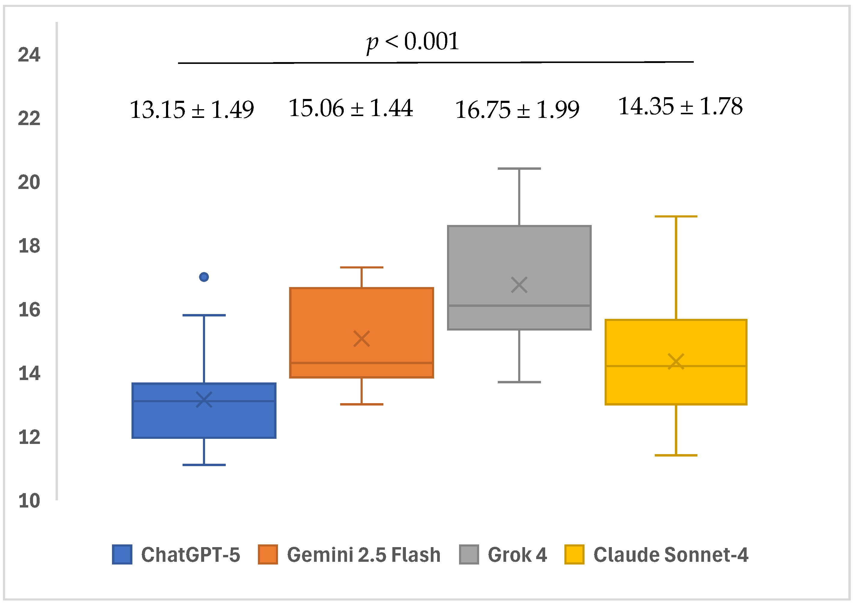 68]. Overall, these findings indicate that ChatGPT-5 demonstrates a relatively superior profile in terms of readability metrics, whereas Grok 4 tends to generate texts with more challenging readability levels.