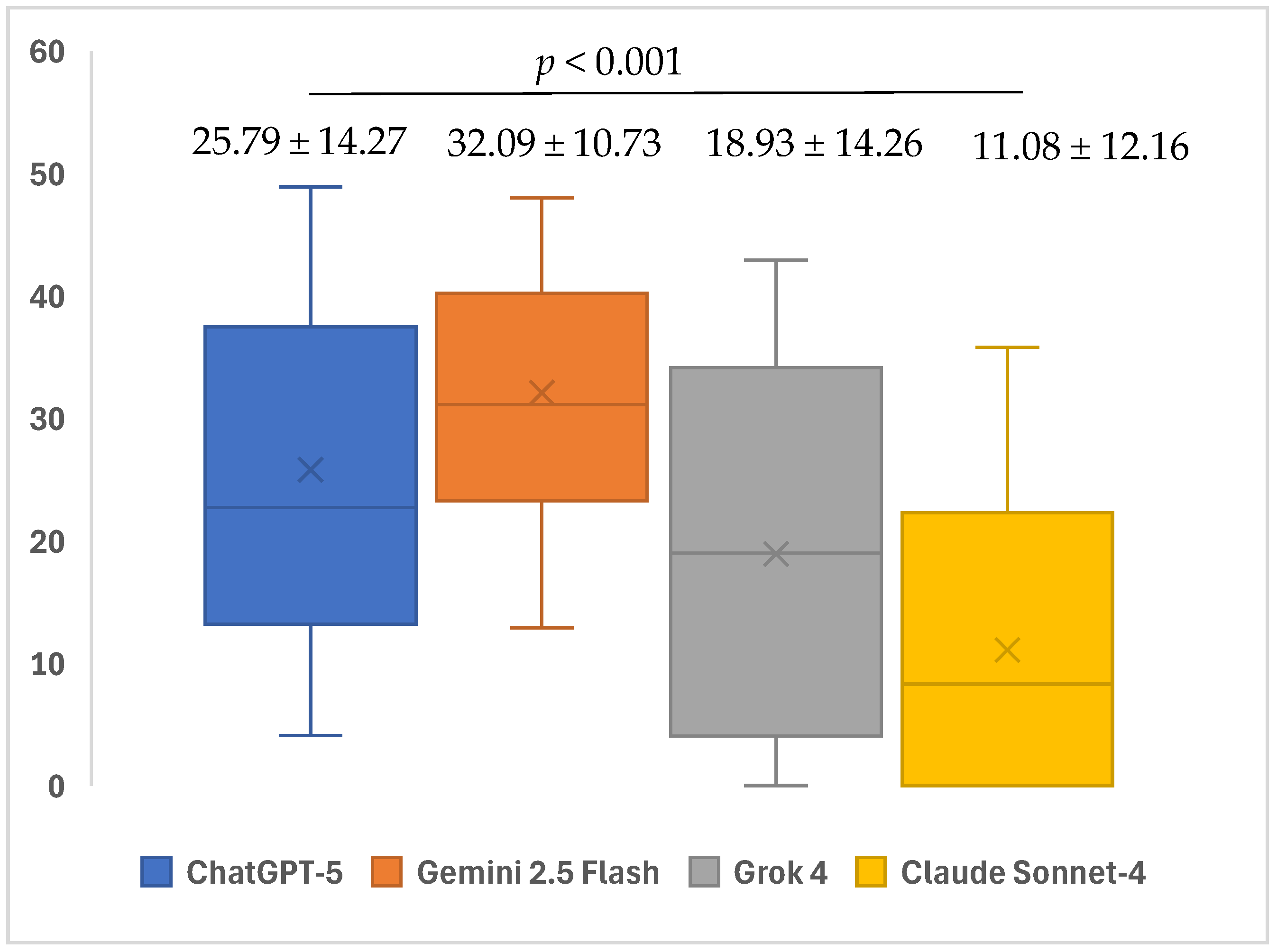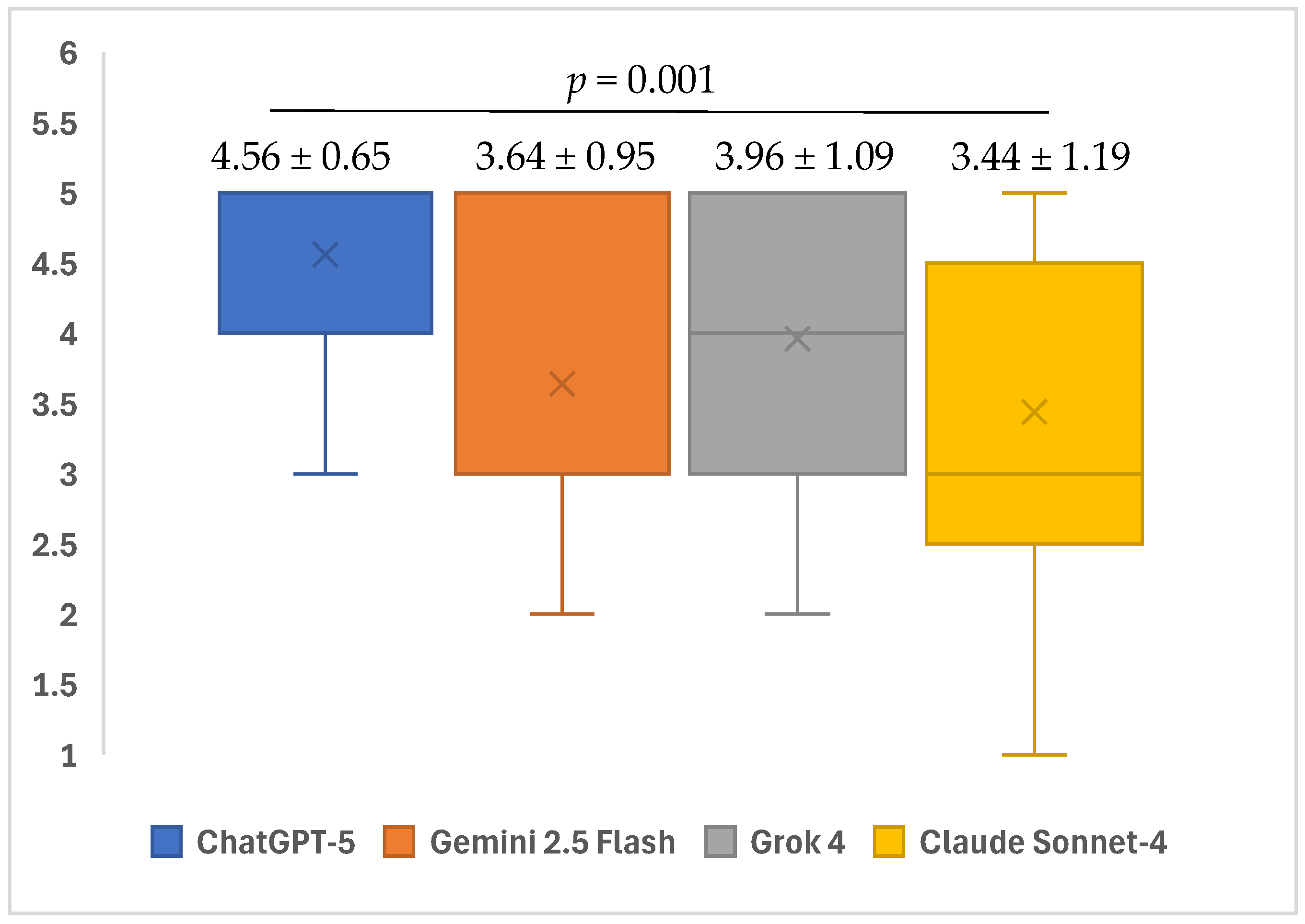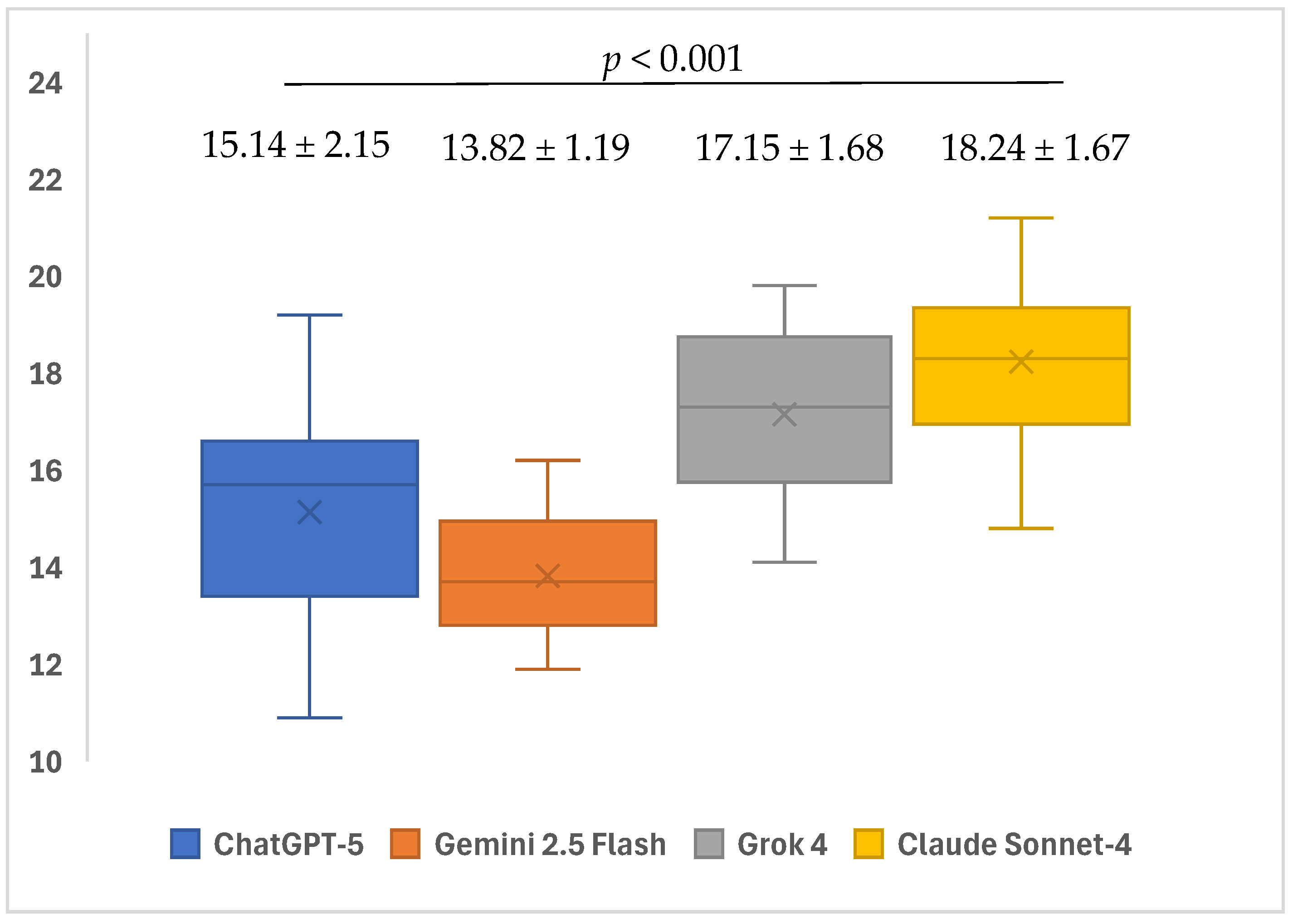 68]. Overall, these findings indicate that ChatGPT-5 demonstrates a relatively superior profile in terms of readability metrics, whereas Grok 4 tends to generate texts with more challenging readability levels.