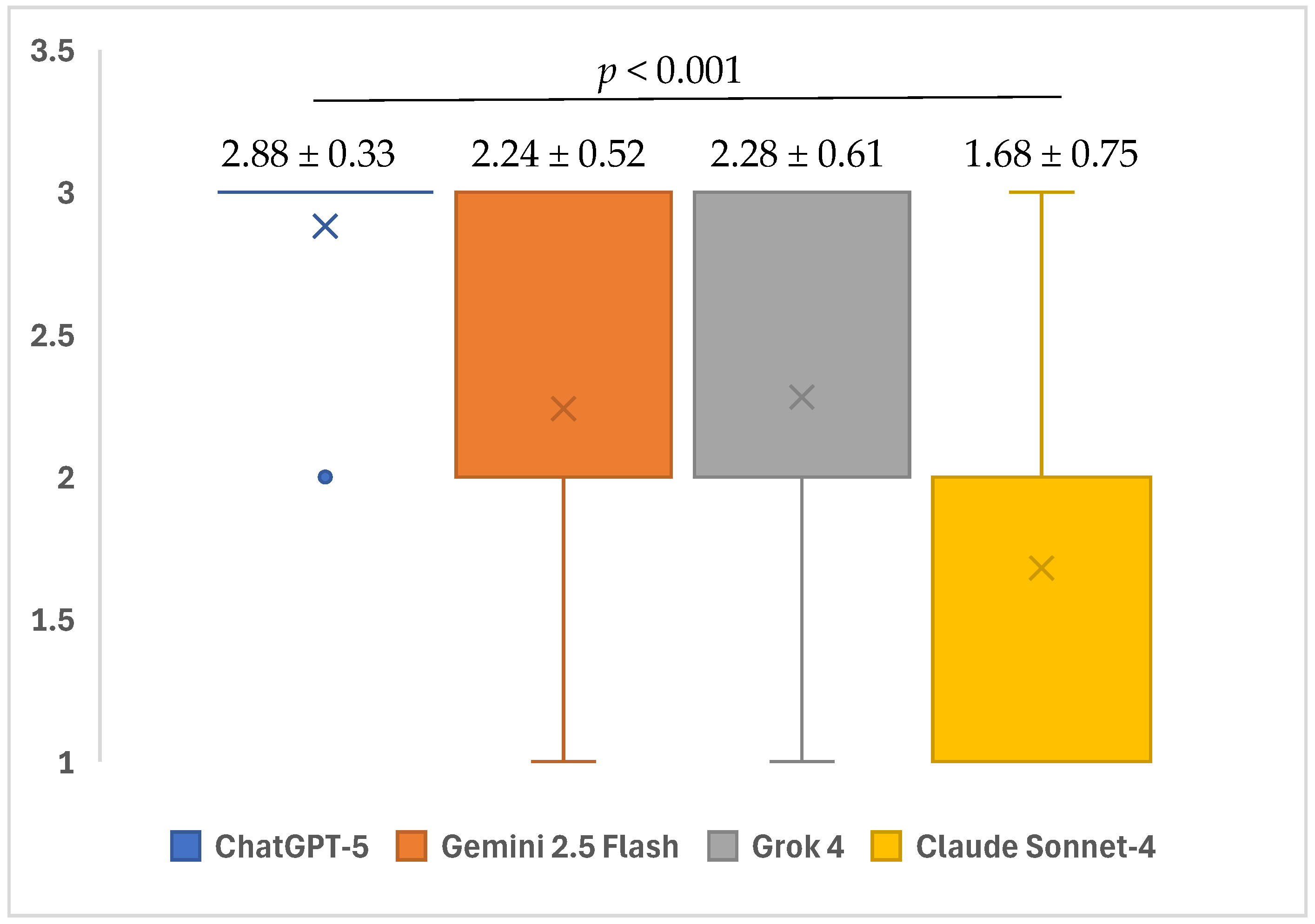 In addition to statistical significance, eta squared (η2) was calculated to assess the magnitude of the differences between groups. For accuracy, η2 = 0.13 indicated a magnitude close to a large effect, while for completeness, η2 = 0.34 revealed a very strong effect size. These findings demonstrate that the differences among models in terms of accuracy and completeness are not only statistically significant but also practically/operationally meaningful.
