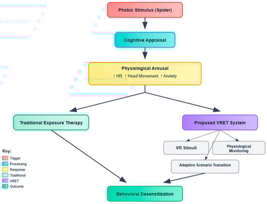 To contextualize the therapeutic pathway underlying spider fear treatment, Figure 1 outlines the cognitive behavioral framework employed in both traditional and virtual exposure paradigms. The model illustrates the process initiated by a phobic stimulus (e.g., spider), which elicits cognitive appraisal and subsequent physiological arousal—manifested as elevated heart rate, increased head movement, and heightened anxiety. While conventional exposure therapy addresses these symptoms through controlled real-world interactions, the proposed VRET system enhances this approach via immersive VR stimuli, real-time physiological monitoring, and adaptive scenario transitions. This integration is designed to facilitate behavioral desensitization through a safer, scalable, and adaptive modality.