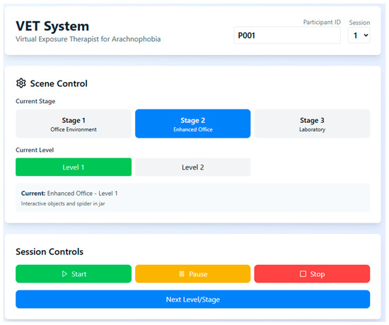 A structured session control interface allows the operator to manually select stages and levels for each participant while tracking their progression and current scenario details. The interactive control panel enables pausing, stopping, or transitioning between levels to maintain therapeutic pacing and prevent overstimulation (Figure 4).