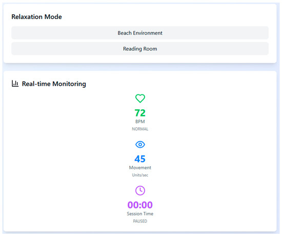 Real-time monitoring interface with relaxation mode options. The system tracks heart rate, head movement, and session duration to guide scenario transitions.