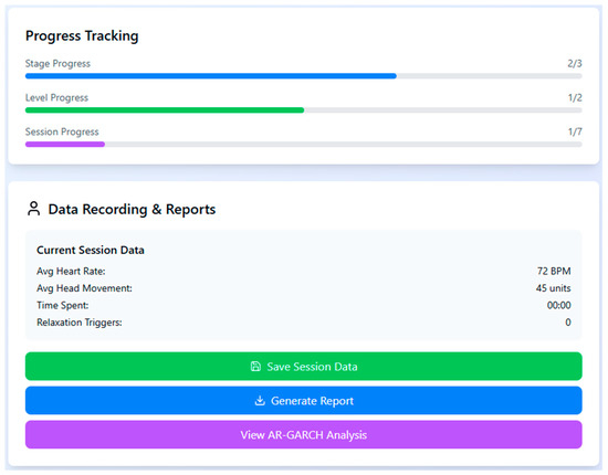 To monitor individual progression and performance during the VRET sessions, a real-time dashboard was used to capture key behavioral metrics such as heart rate, head movement, and time spent in the session. The system also tracked the number of relaxation triggers activated and provided stage-wise progress indicators, enabling both participants and researchers to assess treatment advancement and session completion status (Figure 2).