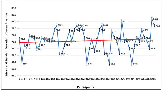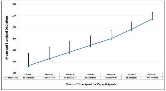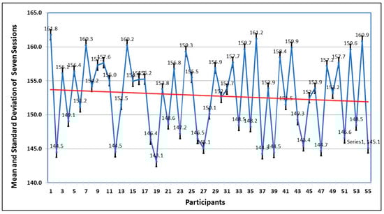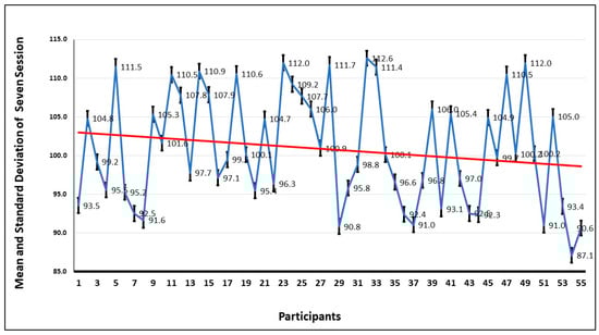 Trend of mean and standard deviations of heart rate by the 55 participants in 7 sessions. The red line shows the mean value, and the blue line shows the range of values over a session.
