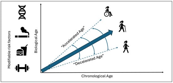 Relation between chronological age and biological age. Biological age is determined by genetic and modifiable factors, leading to accelerated or decelerated aging, hypothetically impacting the patient’s clinical trajectory.