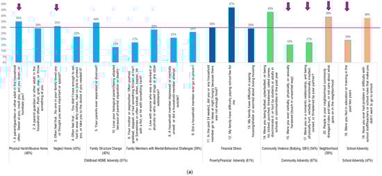 Adversity and stress experiences in Kenyan adolescents. (a) Childhood/home, poverty, and community/school-related adversity experiences: % numbers show in the figure are the proportion of adolescents reported “Yes” for the experience. Arrows are those identified as the top 20 ACEs/stress adversity predictors for adolescent depression. (b) Adolescent Developmental Stress Experience: % numbers shown in the figure are the proportion of adolescents reported moderately, quite, or very stressful. Purple color bars are those identified as the top 20 ACEs/stress adversity predictors for adolescent depression.