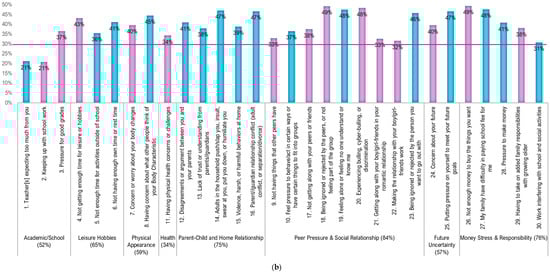 In developmental stress (Figure 1b), 95% of adolescents reported experiencing at least one developmental stressor, and only 5% reported no stress for the listed stressors. The mean total developmental stress count was 11.70 (SD = 6.69) (out of a total of 30), and the mean stress level score (level 1–5) was 2.45 (SD = 0.73). In comparing the stress domains, physical appearance stress showed a significant sex difference, with females reporting higher stress levels (M = 2.73, SD = 1.29) than males (M = 2.40, SD = 1.21; p = 0.031).