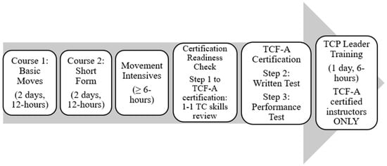 The TCP leader training pathway is rigorous and can take 6–12 months to complete. Figure 1 outlines the complete training. Trainees who complete all the steps become certified instructors in both Tai Chi Fundamentals Adapted (TCF-Adapted) program and the evidence-based TCP program (see Figure 1) [25]. This is much more than many community TC programs require of their trainees/certified leaders. Certified TCP leaders are also expected to remain current and authentic to TC by taking 12 h of continuing education credit every two years.
