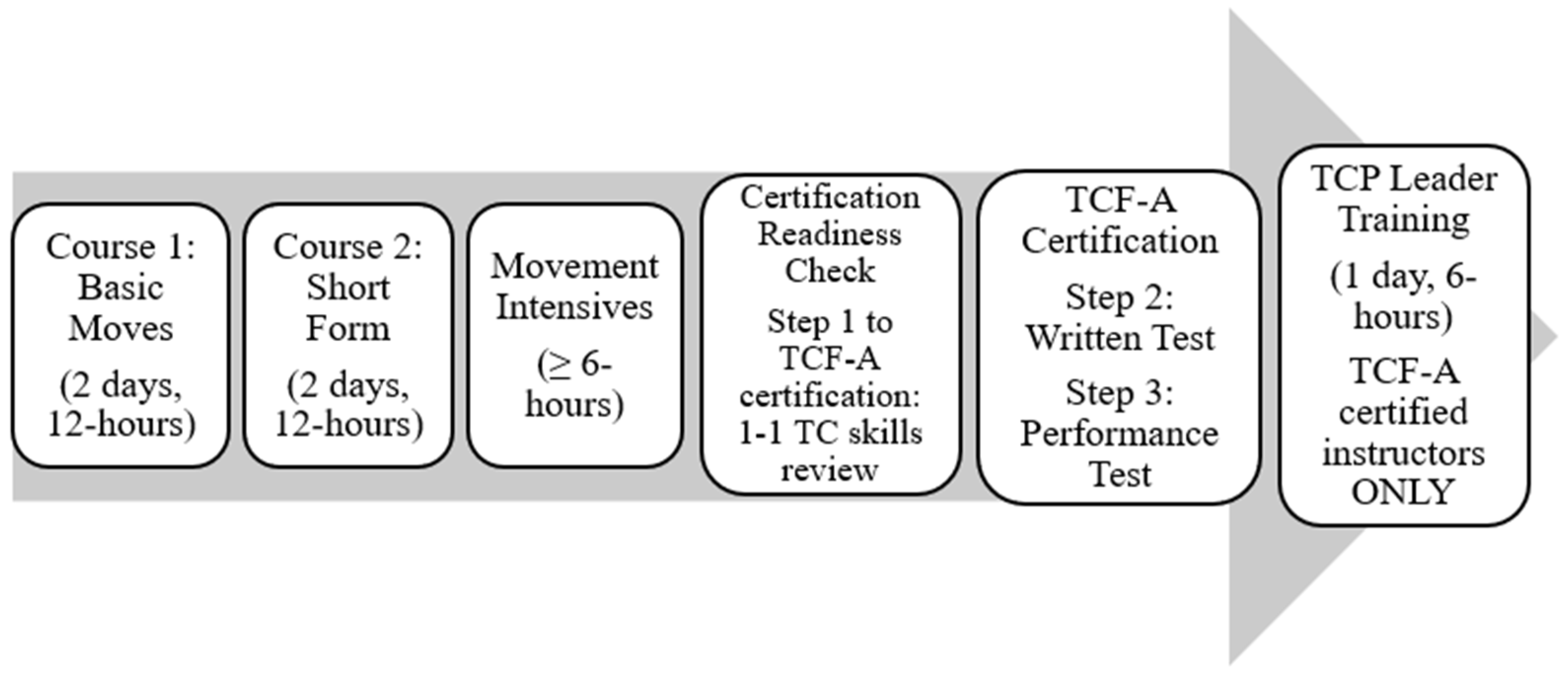 The Intensive courses are supplemental courses. One movement intensive (6 h) is required by all trainees (see Figure 1) to obtain the 30 h of formal training necessary to be eligible for TCF-Adapted certification. Most successful trainees (11 of 13) took one to two extra movement intensives (the first class had 14 participants while the second class had 15 participants).