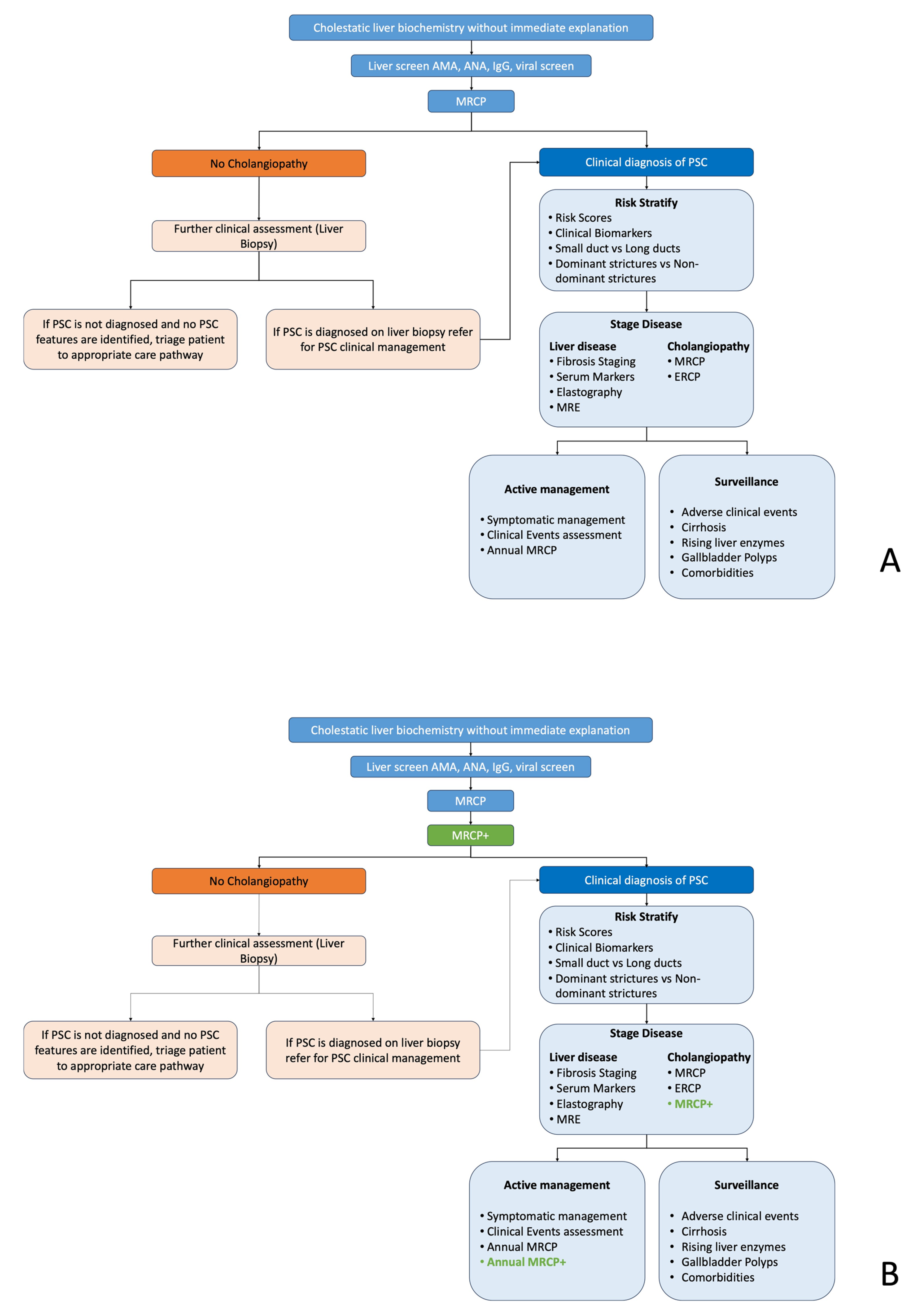 MRCP | 81% | Non-invasive and can spot changes in the bile duct. Preferred noninvasive route for diagnosis of PSC. | Reporting is subjective; therefore, smaller centres with less-experienced radiologists may be under- or over-interpreting images. There is no quantification of the biliary tree. Lacks the resolution to see intrahepatic duct. |