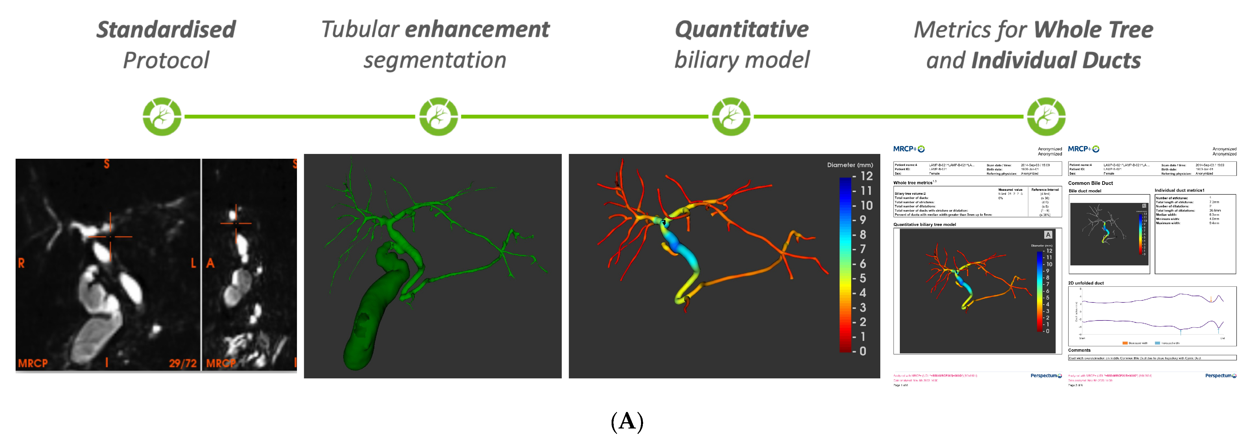 - Trivedi, P.J.; Arndtz, K.; Abbas, N.; Telford, A.; Young, L.; Banerjee, R.; Eddowes, P.; Jhaveri, K.S.; Hirschfield, G.M. Quantitative MRCP and metrics of bile duct disease over time in patients with primary sclerosing cholangitis: A prospective study. Aliment. Pharmacol. Ther. 2024, 59, 1366–1375. [Google Scholar] [CrossRef]
