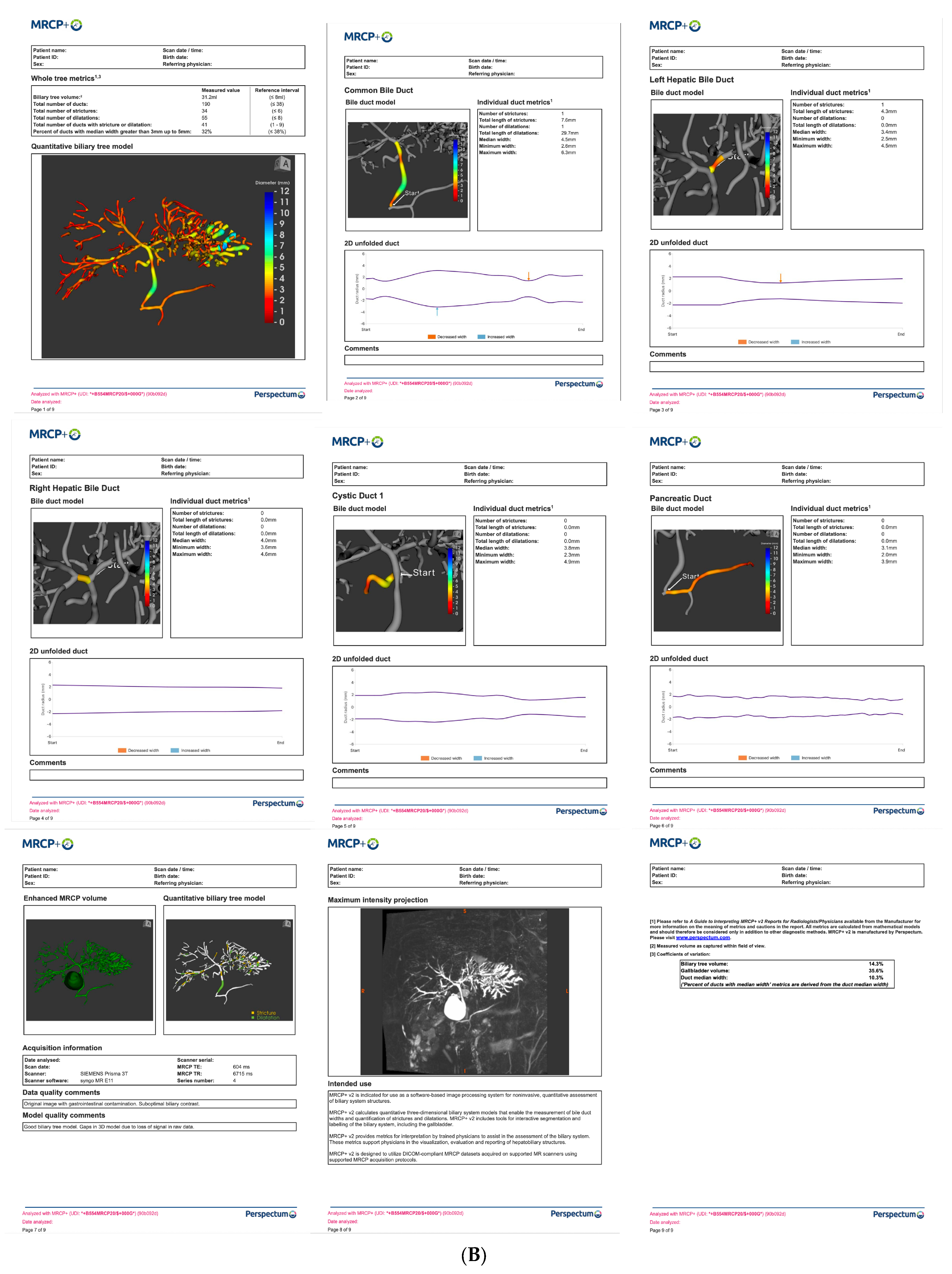 - Harisinghani, M.; Davis, T.; Ralli, G.; Ferreira, C.; Paun, B.; Borghetto, A.; Dennis, A.; Jhaveri, K.; Del Grande, F.; Finnegan, S.; et al. Accuracy, repeatability, reproducibility and reference ranges of primary sclerosing cholangitis specific biomarkers from quantitative MRCP. Abdom. Radiol 2025. Online ahead of print. [Google Scholar] [CrossRef]