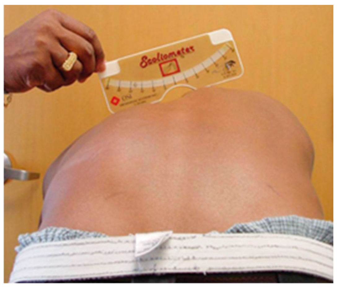 Figure 1. Adams test and ATR measurement with Scoliometer. Source: Álvarez García de Quesada LI, Núñez Giralda A. Idiopathic scoliosis. Pediatr Aten. Primaria. 2011;13(49):135–46 [5].