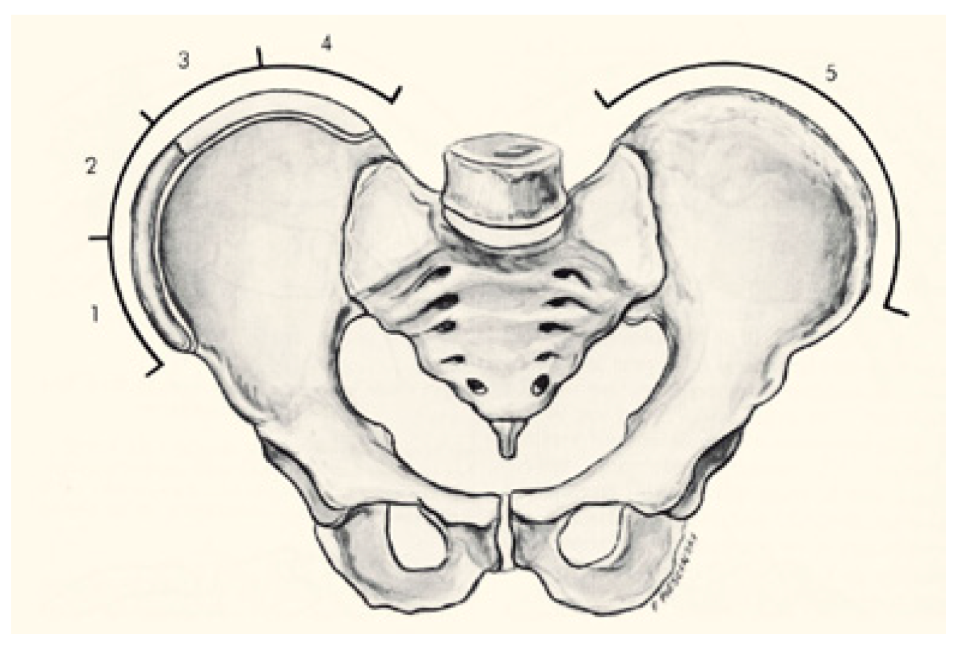 The evaluation of bone maturity is a relevant prognostic factor in AIS. The Risser scale is based on the evaluation of the ossification of the iliac crest observed in the radiograph. This scale is classified into six grades ranging from grade 0 to 5; a low grade indicates less bone maturation and, consequently, a greater potential for growth and risk of progression of the curvature. However, a high grade indicates less growth and, therefore, less possibility of curvature progression (Figure 2). For these reasons, the Risser scale is a fundamental tool in therapeutic decisions about the optimal time to initiate treatment [8].