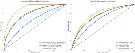 ROC-AUC Curve Comparison. Left panel shows ROC curves using training data predictions (bootstrap AUC), representing model performance on training data. Right panel shows ROC curves using test data predictions (test AUC), representing true generalization performance.