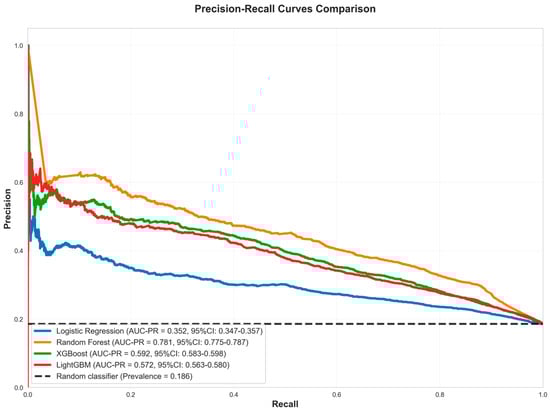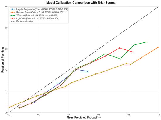 Random Forest maintains competitive accuracy (0.794) and provides the strongest discrimination in the bootstrap ROC curves, though its calibration curve shows overconfidence at higher predicted probabilities. The performance gap between bootstrap and test AUC values highlights the importance of evaluating models on independent test data to assess true generalization performance, particularly when dealing with temporal data where patterns may shift between training and test periods. Figure 2 presents the Precision-Recall Curve Comparison. In Figure 3, Random Forest’s curve departs below the diagonal in mid-to-high probability bins, signaling overconfident estimates despite achieving the lowest Brier score (=0.101 with tight CI), which measures overall probabilistic accuracy; logistic regression tracks the diagonal more closely but with a higher Brier score, illustrating better visual calibration yet less accurate probabilities in aggregate. Taken together, these results indicate that Random Forest offers the best overall model for this task—top ROC-AUC (=0.912), highest AUC-PR, and the best F1—while requiring caution if absolute risks are used, where post hoc calibration (e.g., isotonic or Platt scaling) can improve probability reliability.