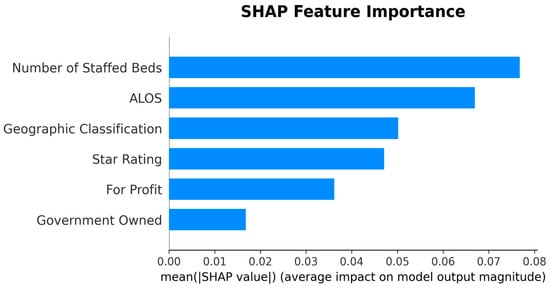 Given the study objective of identifying SNFs with high UTI risk, the Random Forest model was selected for downstream interpretation; SHAP analyses were then conducted to explain its predictions under this operating context. Table 7 presents the features ranked by their mean absolute SHAP values, which quantify the average magnitude of each feature’s contribution to the model’s output. Figure 4 visualizes these results, providing an overview of the relative importance of each feature.