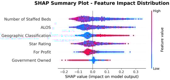 To address this limitation, we present the SHAP Summary (beeswarm) plot (Figure 5), which ranks features by their average impact on model predictions, with Number of Staffed Beds as the most important predictor, followed by ALOS, Geographic Classification, Star Rating, For Profit, and Government Owned. While the summary plot effectively displays feature importance, its visual complexity can make directionality less clear, especially when high and low feature values overlap in their SHAP contributions.