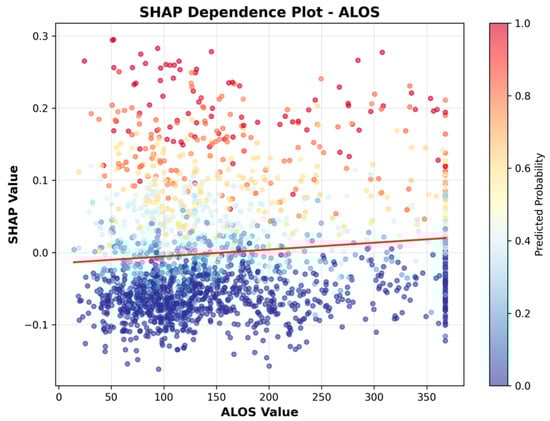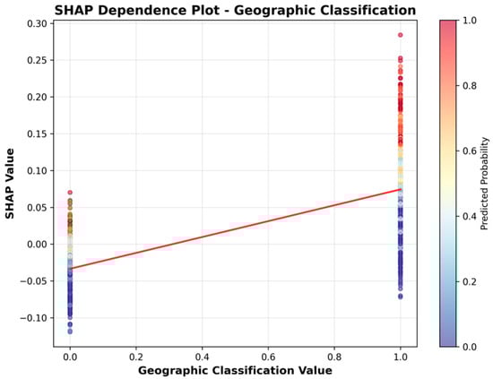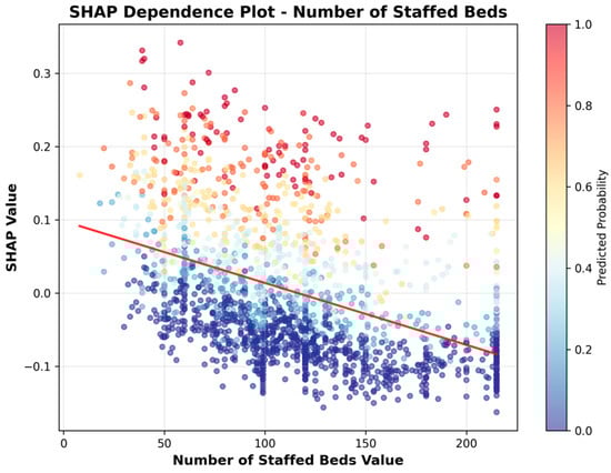 To more clearly illustrate the direction of association, we include SHAP dependence plots (Figure 6, Figure 7, Figure 8, Figure 9, Figure 10 and Figure 11). For example, the dependence plot for Number of Staffed Beds shows a negative relationship: facilities with fewer staffed beds have higher SHAP values, indicating increased predicted UTI risk, while those with more staffed beds have lower risk. Similarly, the dependence plot for Geographic Classification demonstrates that rural status is associated with a higher predicted risk. These plots provide a direct visualization of how feature values influence the model’s output, clarifying both importance and direction.
