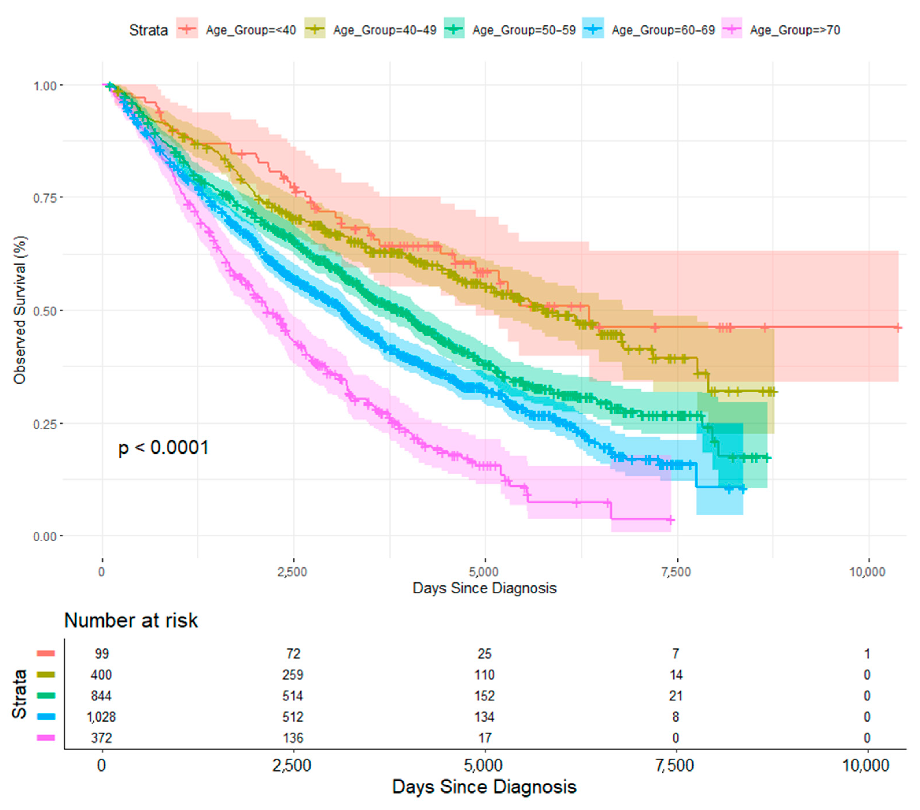 22] analyzed data from the Surveillance, Epidemiology, and End Results (SEER) program and found that five-year overall survival rates for patients aged ≤60 years were significantly higher (62%) compared to those aged 70+ (34%). The log-rank test confirmed significant differences in survival distributions (