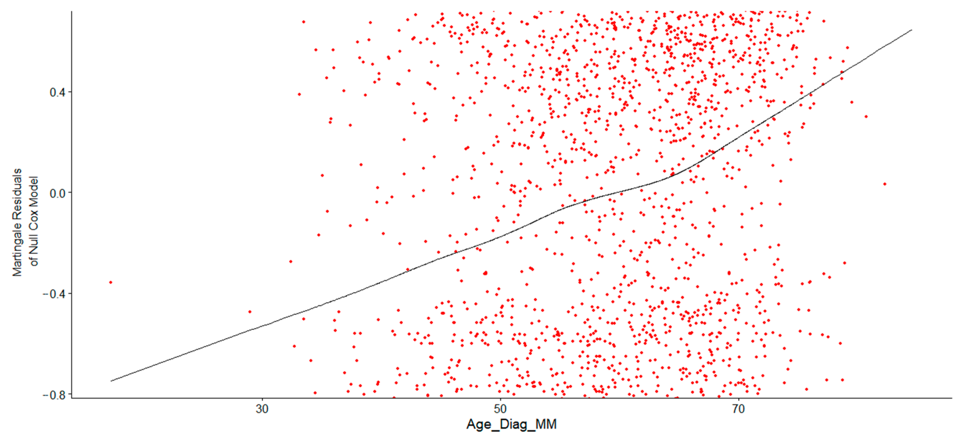 Figure 3, after examining the Martingale residual plot to verify whether the log transformation was appropriate, the LOESS curve displayed an increasing trend, indicating that the residuals were not centered around zero. This suggested that the log transformation of Age at Diagnosis might not fully capture its relationship with survival time and that a nonlinear pattern exists, which was thus not well-represented by a simple log transformation of Age at Diagnosis. To address this, an alternative approach was considered using restricted cubic splines in R to model the nonlinear relationship between Age at Diagnosis and survival in MM patients. The log of Age at Diagnosis was modeled using natural splines with three degrees of freedom. The likelihood ratio test, Wald test, and log-rank score test confirmed that the overall model was statistically significant, indicating that the spline-based approach effectively captured the relationship between age and survival. The spline terms provide a nonlinear relationship between log of Age at Diagnosis and survival (
