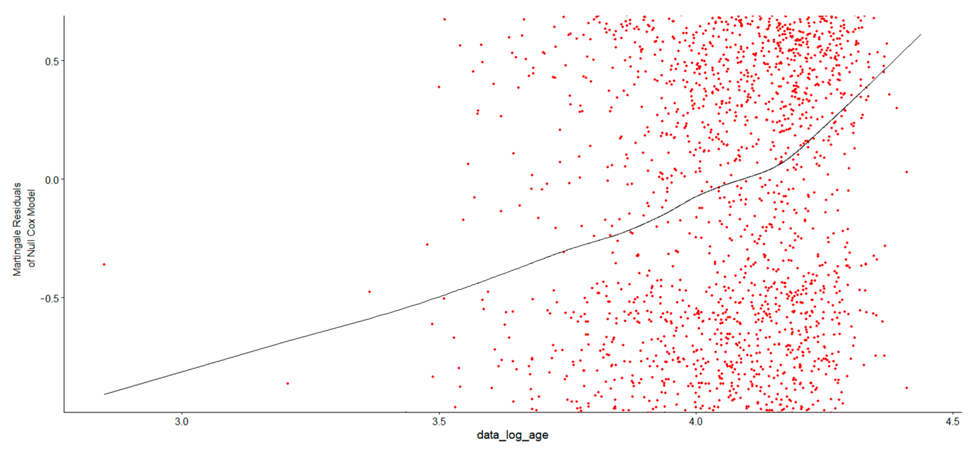 Figure 2 shows the verified and correct specification of Age at Diagnosis in the Cox proportional hazards model. Consider the LOESS curve (black line). The curve in the trend line indicated a nonlinear relationship between Age at Diagnosis and the log hazard, suggesting that a simple linear term might not adequately capture this association. Consequently, a transformation, such as a logarithmic or polynomial function, or the use of restricted cubic splines (RCS), was necessary to properly fit the model. Initially, a log transformation was applied to Age at Diagnosis, and the Cox regression model output confirmed that log-transformed Age at Diagnosis was a significant predictor of survival time, with event status determining whether death occurred. The results demonstrated that log-transformed age was highly significant in predicting survival. The hazard ratio remained statistically significant, as its entire confidence interval was above 1, indicating that higher log-age consistently increased the hazard. Older patients (with higher log-age) exhibited significantly poorer survival outcomes.