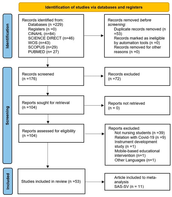 A total of 229 records were identified through various databases. Using the Zotero reference manager, 53 duplicates were removed, leaving 176 records for title and abstract screening. Of these, 104 full-text articles were retrieved for detailed evaluation. At this stage, studies were excluded if they did not report nursing students separately from other disciplines (n = 39), if they were related to COVID-19 (n = 9), if they focused on the development of an instrument (n = 1) [25], if they described educational audiovisual content via smartphones (n = 1) [26], or if they were published in other languages (n = 1). In total, 51 reports were excluded. Finally, 53 studies were included in the systematic review. The selection process is illustrated in Figure 1.
