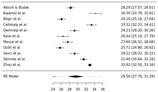A random-effects meta-analysis was conducted using Jamovi version 2.6 (MAJOR module), applying Restricted Maximum Likelihood Estimation to model between-study variance. The pooled mean SAS-SV score was 29.50 (95% CI 27.70–31.29), indicating a moderate average level of problematic smartphone use among nursing students. This result is illustrated in Figure 2, which presents the forest plot with the mean scores and corresponding confidence intervals for each study.