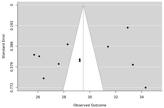 The pooled SAS-SV mean was 29.5 (95% CI 27.7–31.3), with very high heterogeneity (I2 = 97.9%, τ2 = 8.97; Q(10) = 485.2, p < 0.001). The 95% prediction interval (23.4–35.6) indicated that average scores in future comparable studies are expected to fall within this range. Sensitivity analyses excluding studies with approximated means, item-to-total conversions, or higher risk of bias yielded consistent results. Tests for small-study effects showed no evidence of publication bias (Egger’s p = 0.982; Kendall’s τ = −0.018, p = 0.94) (Table 5). A leave-one-out analysis confirmed the stability of the pooled estimate. The trim-and-fill procedure did not impute missing studies, supporting the robustness of the pooled estimate. The funnel plot is shown in Figure 3.