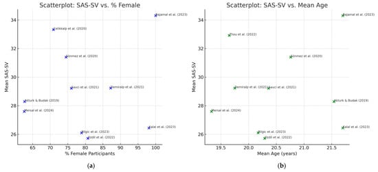 Scatterplots SAS-SV. Note: Exploratory scatterplots of mean SAS-SV scores against (a) percentage of female participants and (b) mean age of nursing student cohorts [1,10,12,13,16,21,27,51,54,56,58]. Data are derived from the 11 studies included in the meta-analysis (Table 4). Missing values for sex distribution [27] and mean age [21] explain why not all studies are represented in each plot.