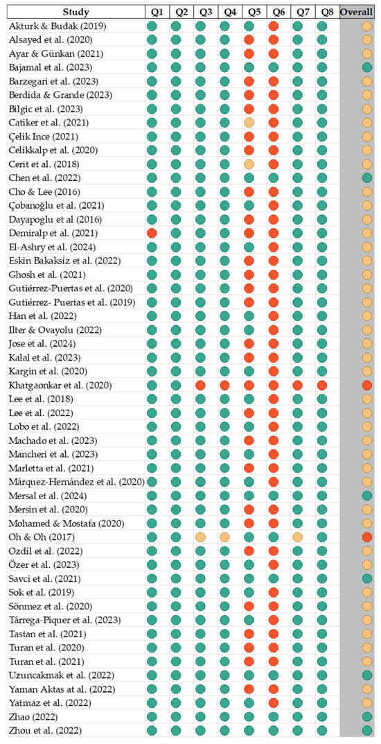 A summary of the risk of bias ratings using the JBI Critical Appraisal Checklist for Analytical Cross-sectional Studies (8 items: Q1–Q8) [22] is in Supplementary Table S3. One quasi-experimental study, Bayir et al. [23], was appraised using the JBI Checklist for Quasi-Experimental Studies, showing low risk of bias despite the lack of blinding and some sample attrition, is flagged as NA in the cross-sectional table.