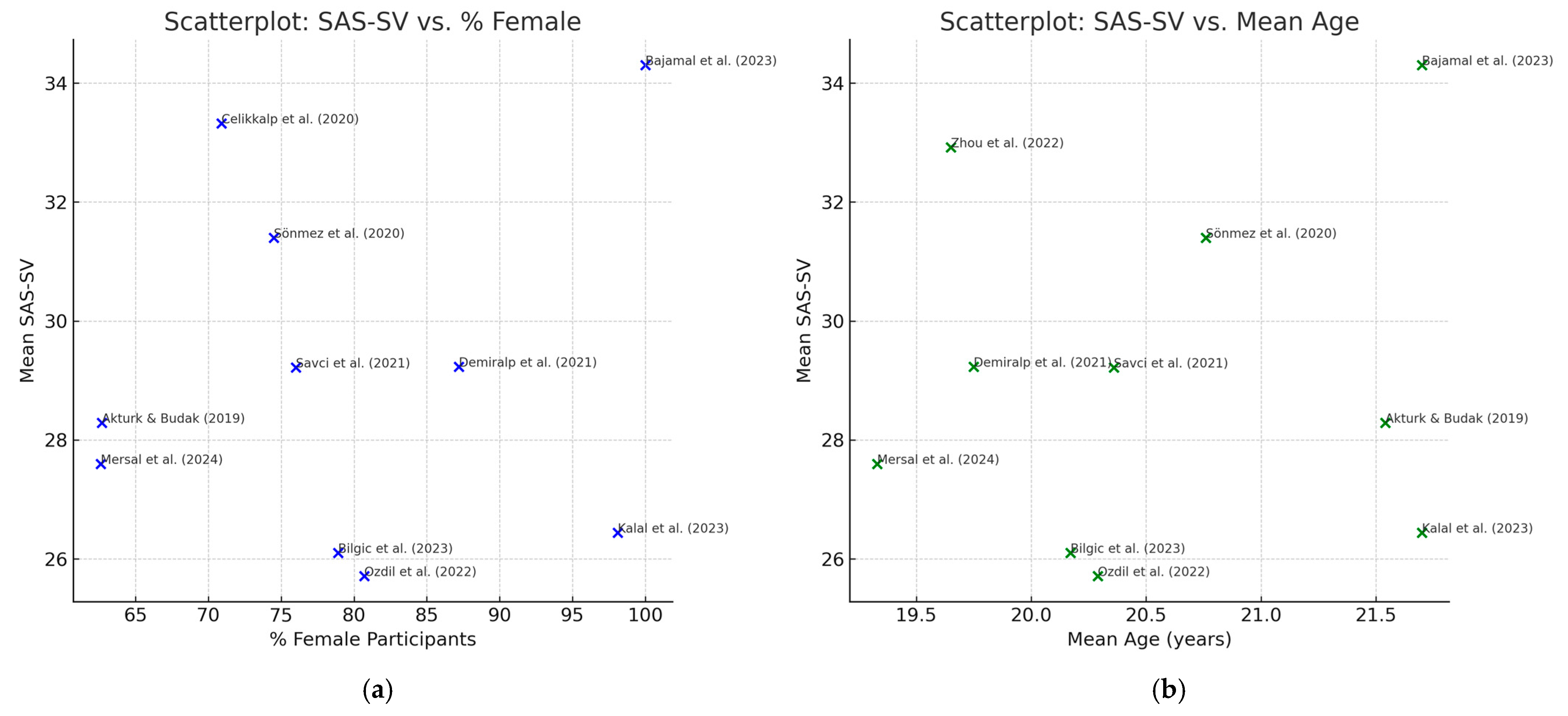 | Meta-analysis inclusion | SAS-SV studies with complete statistical data (n, mean, SD or convertible equivalents) | Stratified data without subgroup pooling; approximated pooled means (except for sensitivity analyses) |