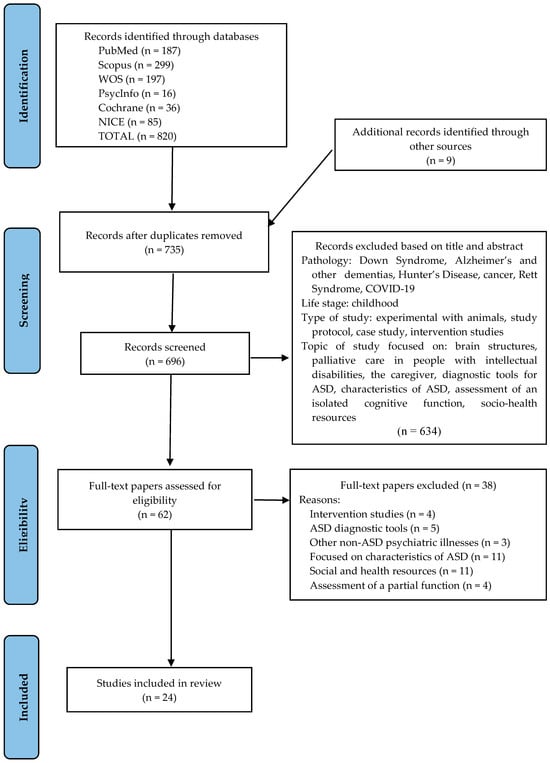 The search was conducted in MEDLINE (PubMed), PsycInfo, Scopus, Web of Science (WOS), the National Institute for Health and Care Excellence (NICE), and Cochrane from 1 January 2003 to 15 August 2025, with no language restrictions. Results were updated on 27 August 2025. Based on the terms “Autism Spectrum Disorder”, “Intellectual Disability”, “Aging”, “Frailty”, “Frail Elderly”, and the free term “assessment”, we used the following search command: (((“Autism Spectrum Disorder”[Mesh]) OR (“Intellectual Disability”[Mesh])) AND (((“Aging”[Mesh]) OR (“Frailty”[Mesh])) OR (“Frail Elderly”[Mesh]))) AND (assessment). The search was completed with additional papers obtained through the snowball method with backward citation tracking [22,23]. The search strategies used in various databases are detailed in Supplementary File S1.