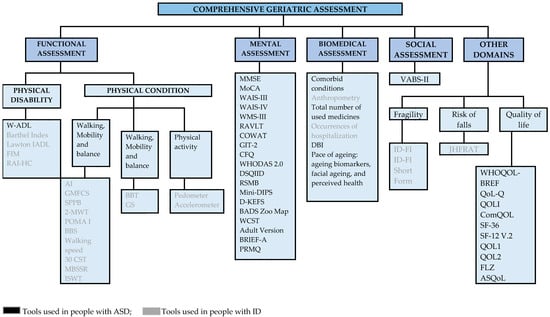 The CGA tools obtained in the scoping review are shown in Figure 2. A total of 57 tools have been identified, of which 34 have been used in people with ASD and 23 in people with ID. Specifically, 19 tools correspond to the functional domain (1 ASD, 18 ID), 18 to the mental domain (18 ASD), 6 to the biomedical domain (4 ASD, 2 ID), 1 to the social domain (1 ASD), 2 to assess frailty (2 ID), 1 for the risk of falls (1 ID), and 10 for quality of life (10 ASD). Supplementary File S4 presents the availability and key psychometric properties of these scales.