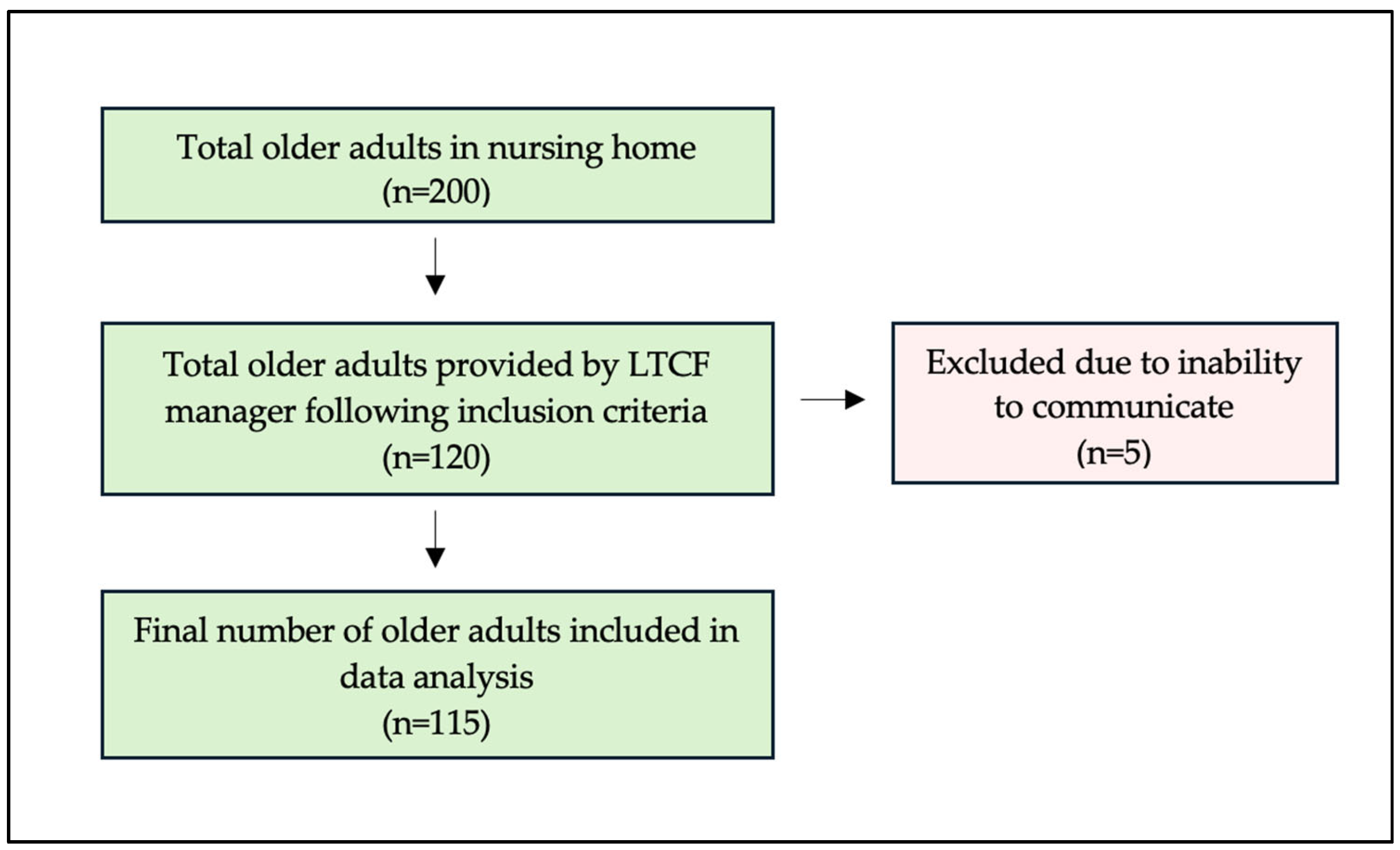 A total of 115 older adult residents who met the inclusion criteria were included in the study for data analysis (