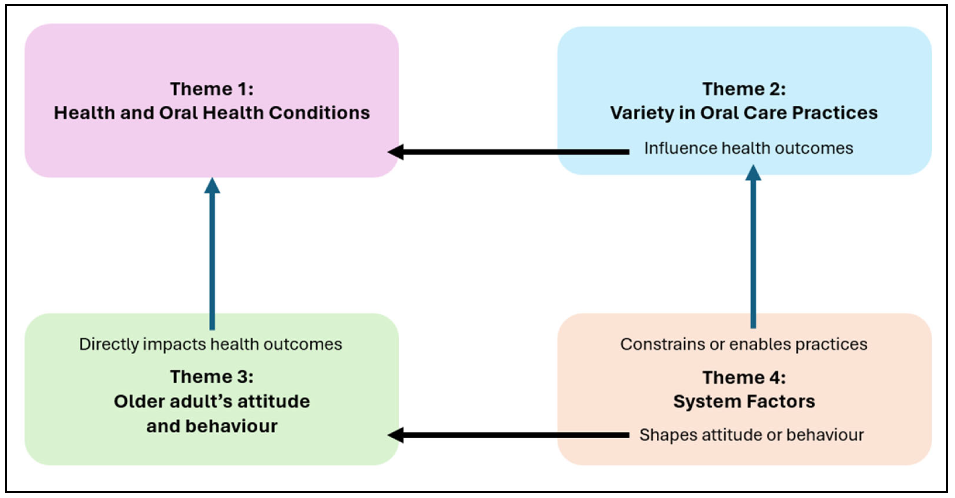 Figure 3). System factors were described by caregivers as shaping both oral care practices and residents’ health conditions while also influencing attitudes and behaviors toward oral care. Caregivers reported that residents’ attitudes and behaviors (e.g., non-cooperation, resistance) directly affected oral health outcomes. Similarly, the variety of oral care practices adopted in the facility was found to influence residents’ oral health conditions. Together, these interconnected themes highlight the multilevel challenges that shape the oral health of older adults in long-term care facilities.